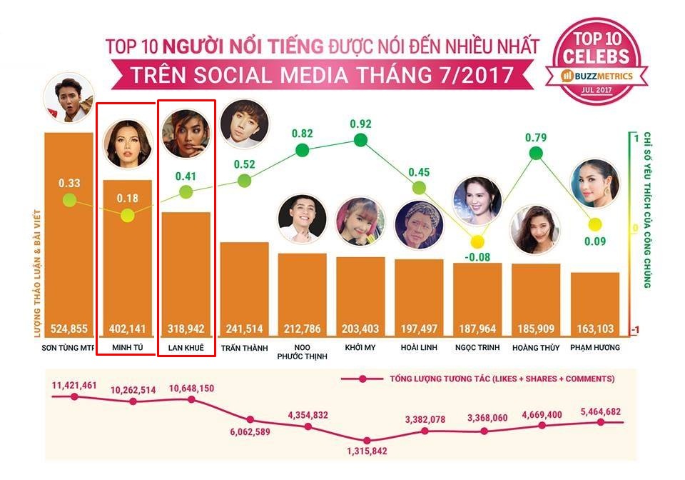 Ngoài ra, trước đó trong tháng 7, các vị HLV Minh Tú, Lan Khuê, Hoàng Thùy cũng nằm trong top 10 người nổi tiếng được nói đến trên social. Riêng Minh Tú, Lan Khuê lần lượt đứng vị trí thứ 2, thứ 3 chỉ xếp sau Sơn Tùng MTP. Dự đoán tháng 8, tháng 9, các HLV vẫn tiếp tục giữ sức nóng trên mạng xã hội. Trong khi Hoàng Thùy thu hút dự luận với quyết định tham gia Hoa hậu Hoàn Vũ, Lan Khuê tái xuất trong dự án điện ảnh Mẹ chồng thì Minh Tú cũng gây được dấu ấn với loạt hoạt động trong vai trò Gương mặt thương hiệu.