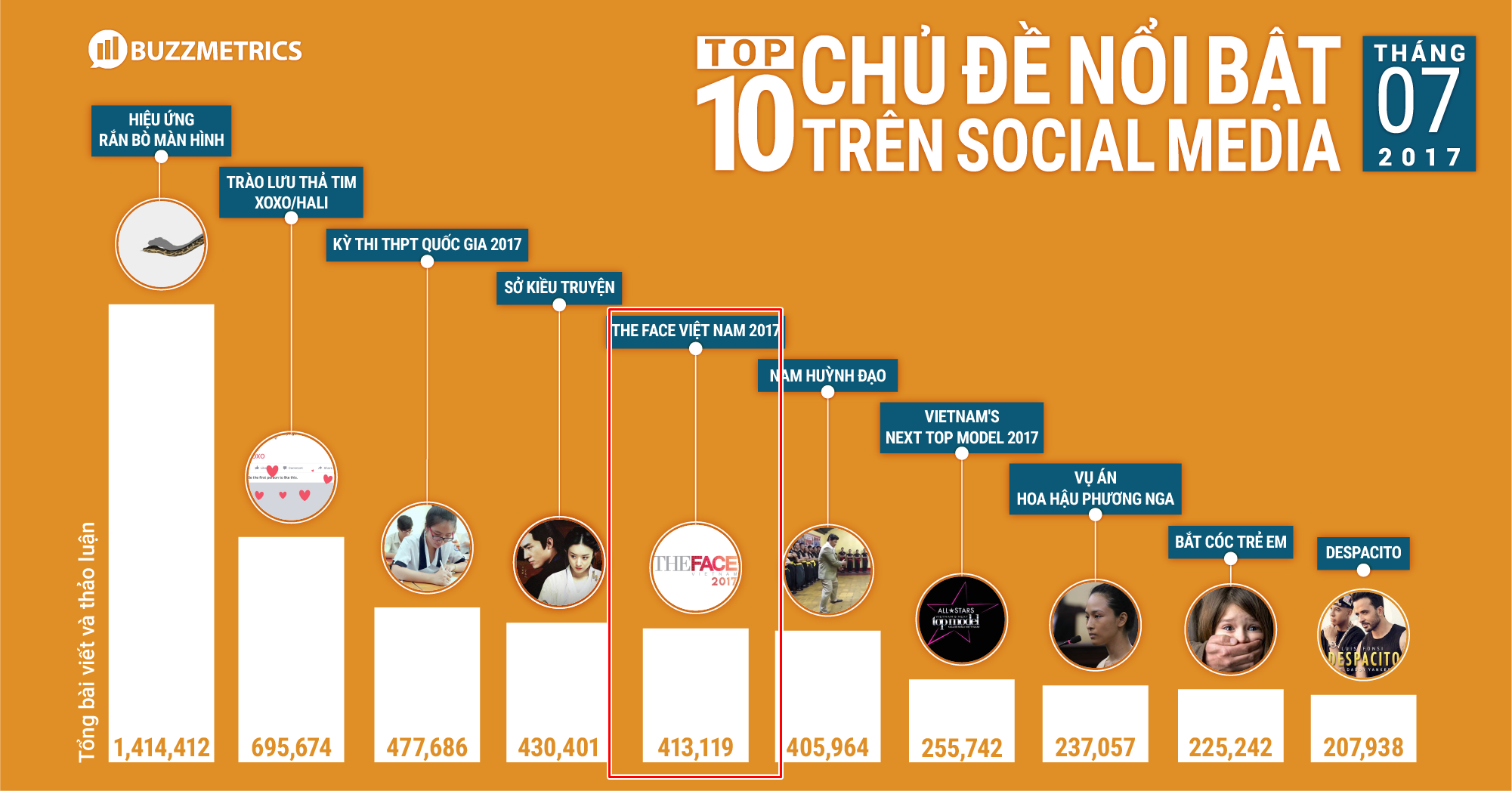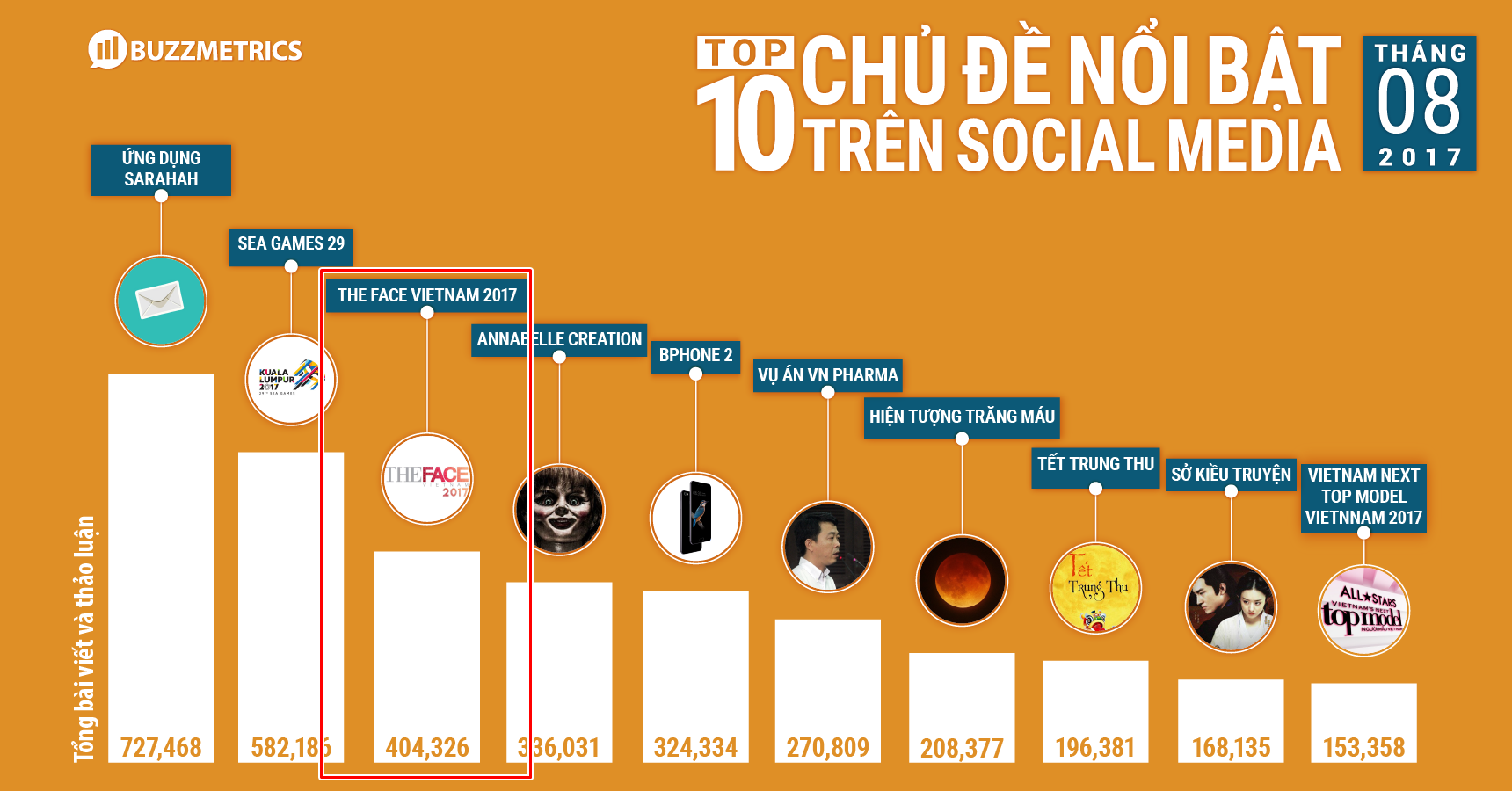 Dù đã kết thúc, The Face vẫn giữ vững sức hot và độ lan tỏa của mình khi chễm chệ vị trí thứ 3 trong BXH “Top 10 chủ đề nổi bật trên mạng xã hội tháng 8”. Chương trình thực tế này chỉ chịu đứng sau hai chủ đề gây bão thời gian qua là làn sóng ứng dụng Sarahah và Seagames 29. Trong tháng 8, các tập bán kết gay cấn cộng với đêm chung kết trực tiếp đã góp phần tạo nên sức ảnh hưởng lớn tới cộng đồng mạng. Việc Tú Hảo team Lan Khuê đăng quang Quán quân cũng thu hút sự chú ý của dư luận. Các khoảnh khắc trong đêm chung kết được fan mổ xẻ và tạo thành nhiều meme, ảnh chế, gif chế