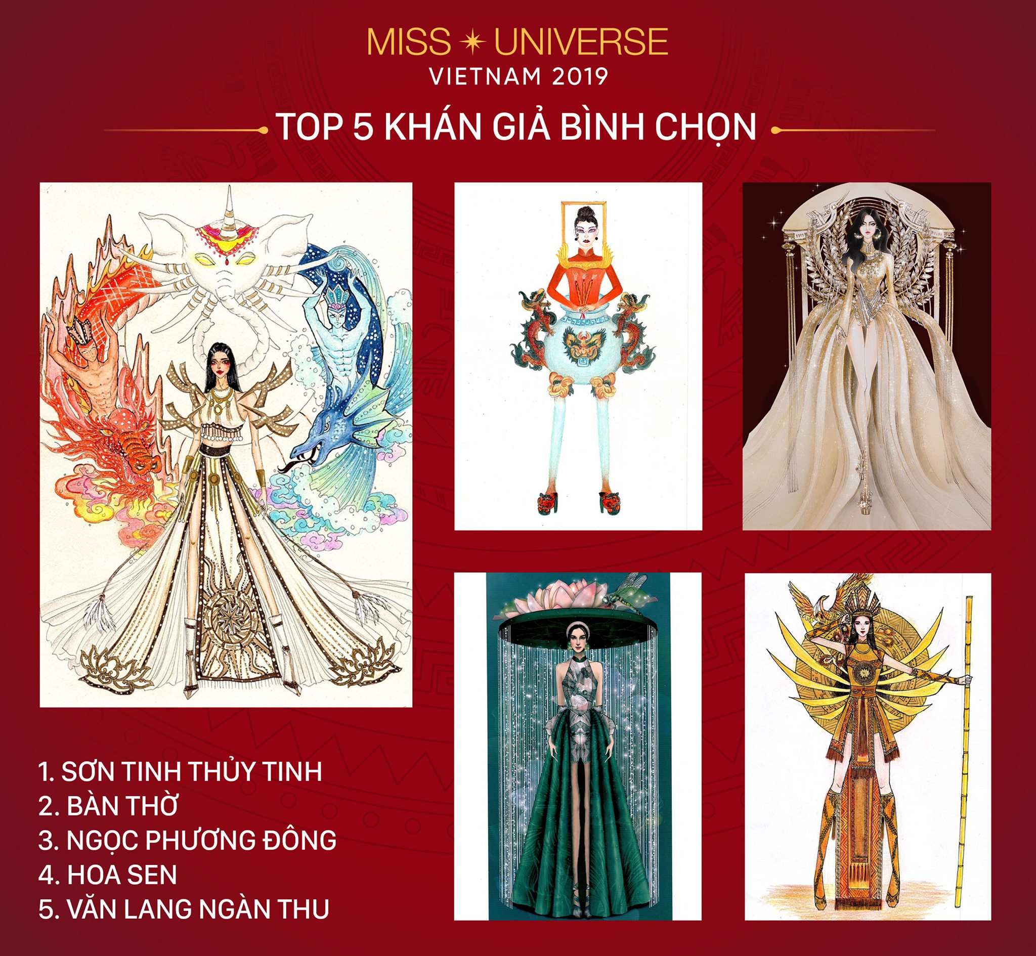 Ngoài 5 bài thi chắc chắn góp mặt trong vòng thuyết trình ý tưởng là “Sơn Tinh Thủy Tinh”, “Bàn thờ”, “Ngọc phương Đông”, “Hoa sen”, “Văn Lang ngàn thu”, những mẫu trang phục dân tộc góp mặt lọt vào Top 10 dẫn đầu bình chọn chắc chắn “trong tầm ngắm” của dàn giám khảo chuyên môn.
