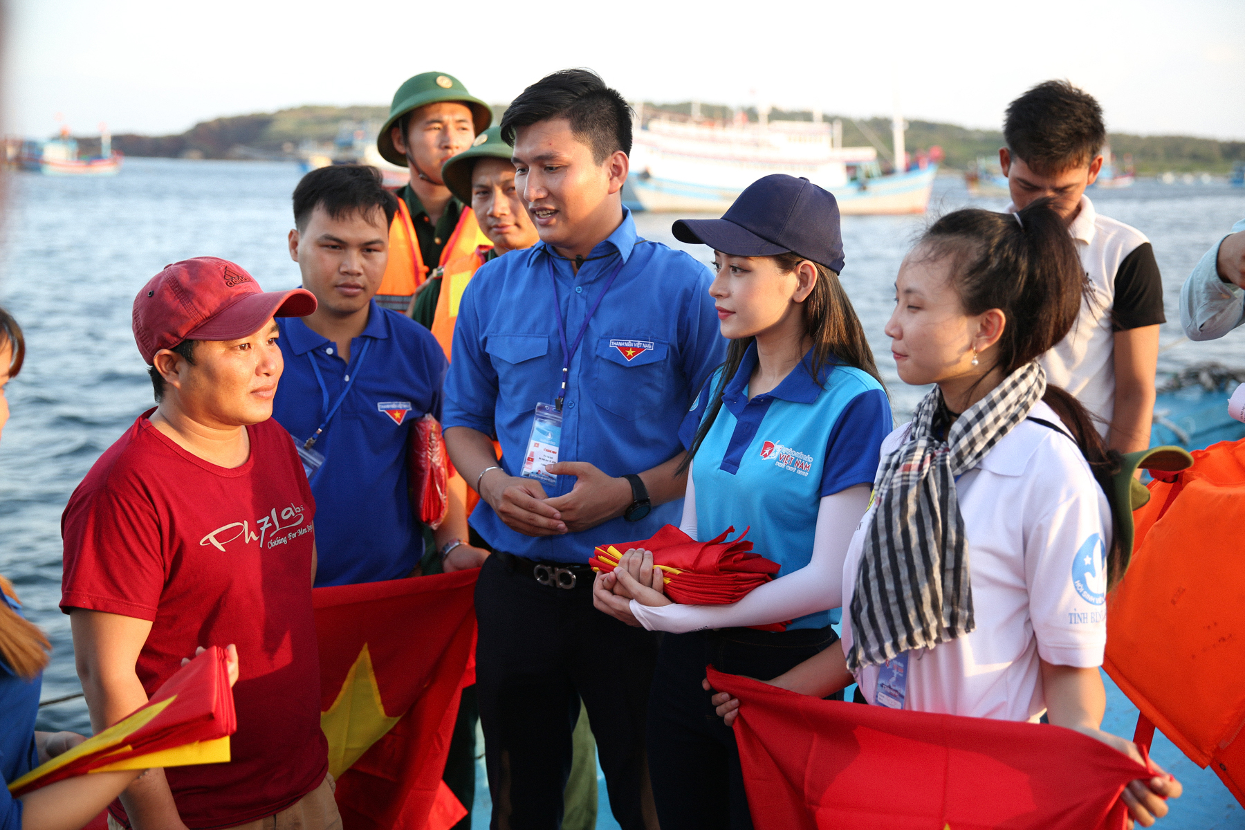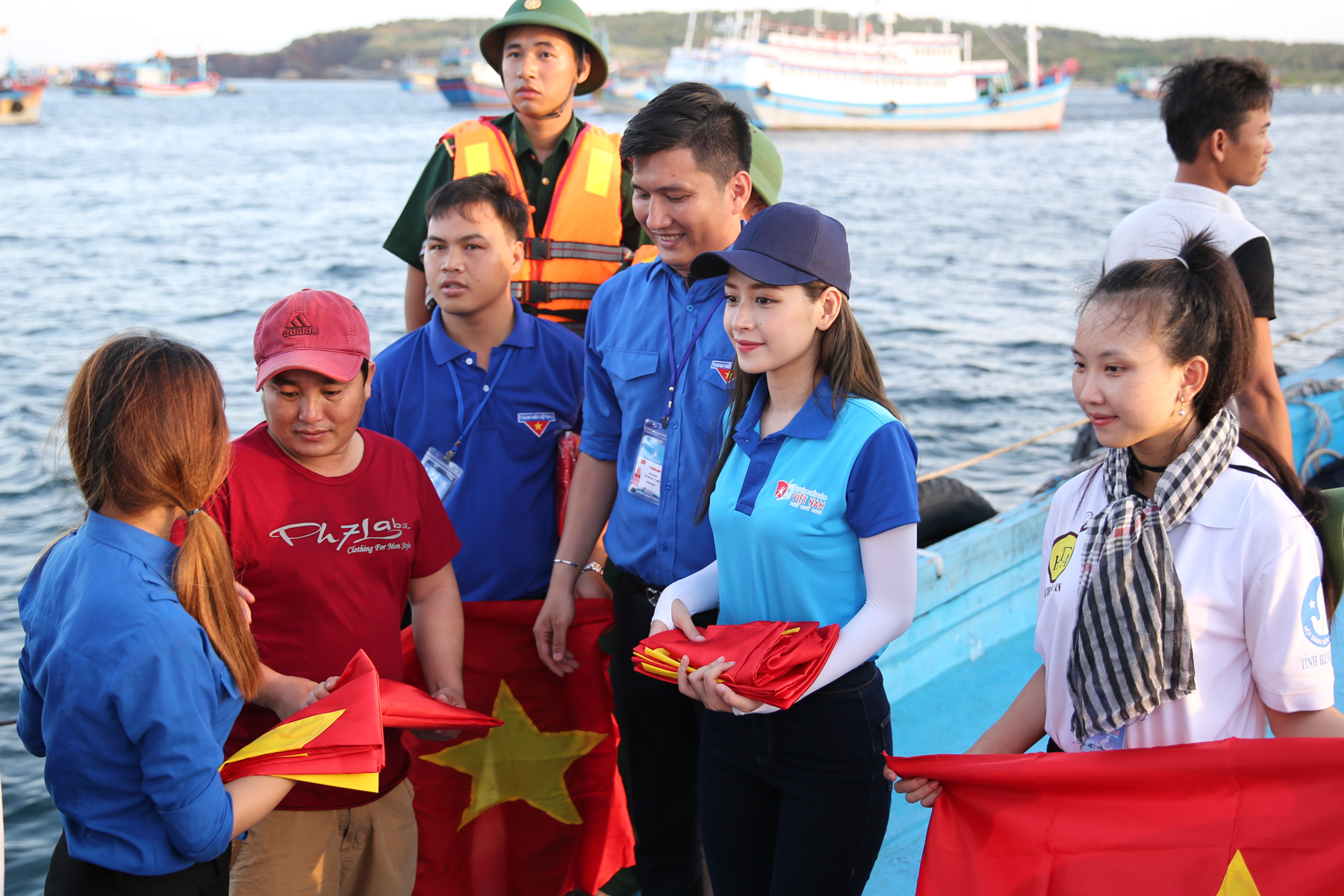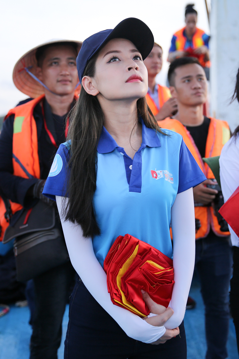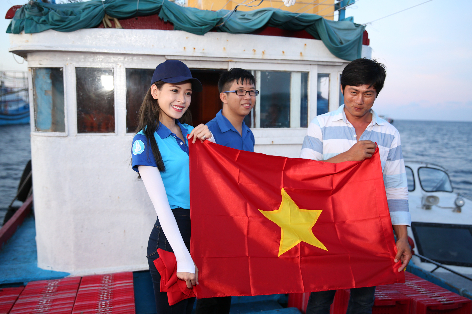 Chi Pu cùng đại diện Trung ương Hội Sinh viên Việt Nam và những thanh niên trẻ tiêu biểu đã ghé cảng, đi ca nô ra thuyền để trao tặng cờ Tổ quốc cho các ngư dân.