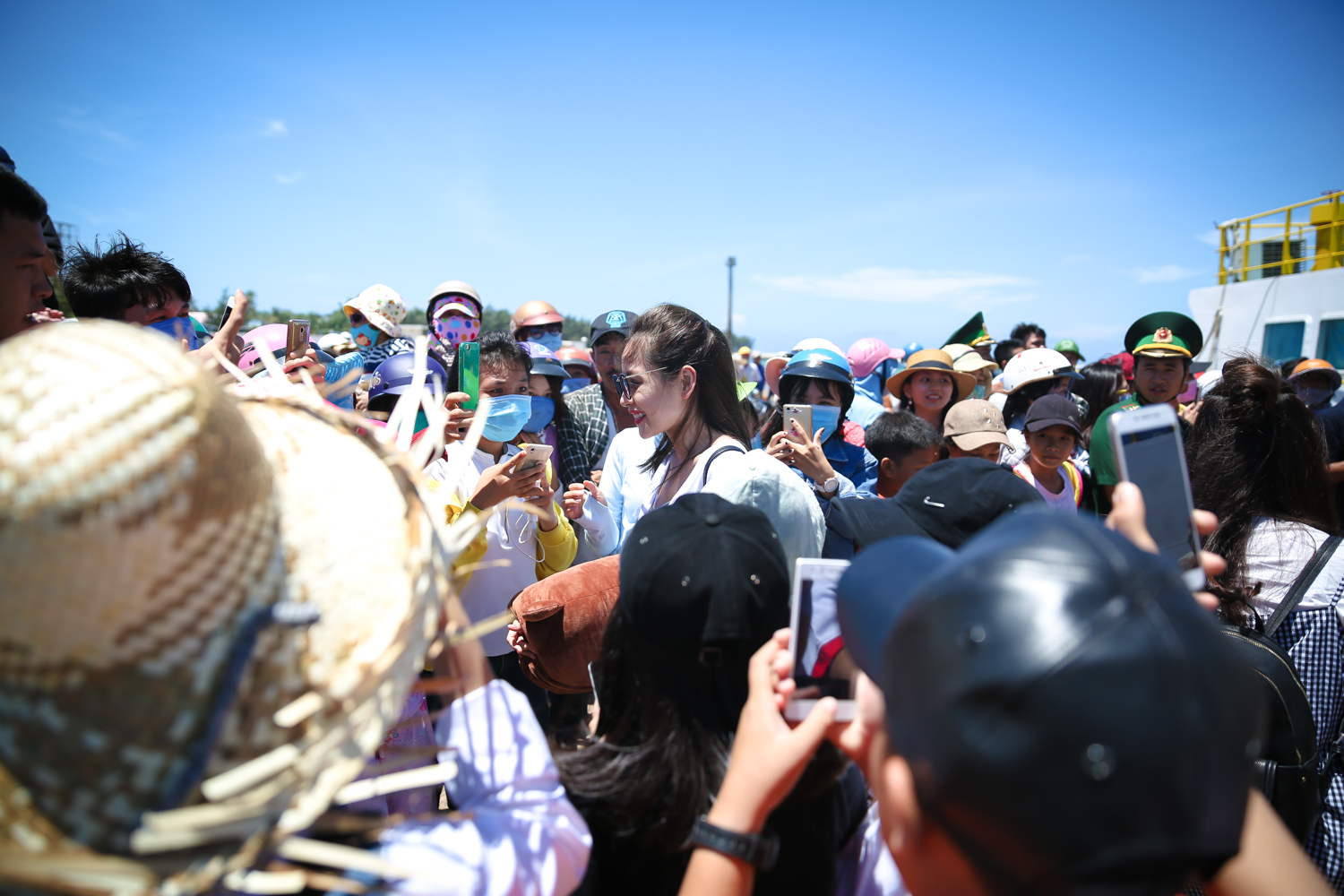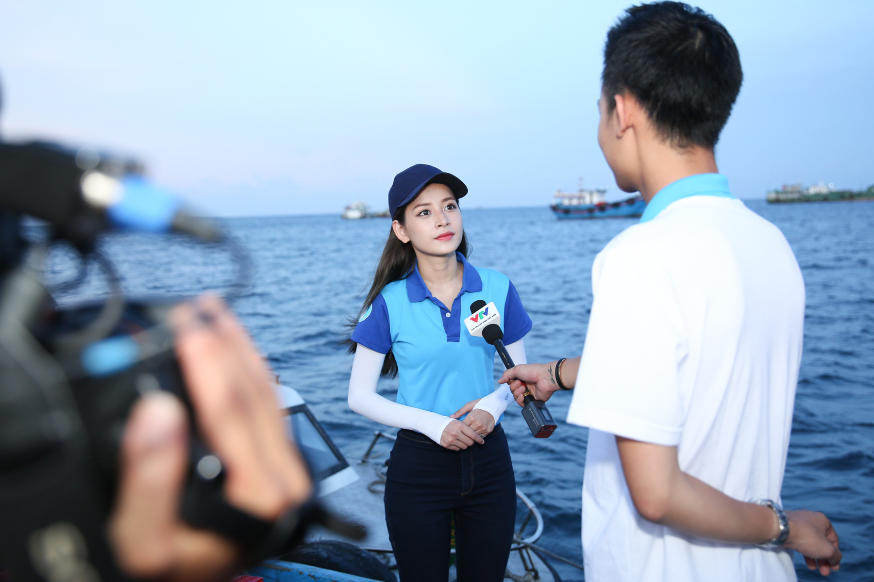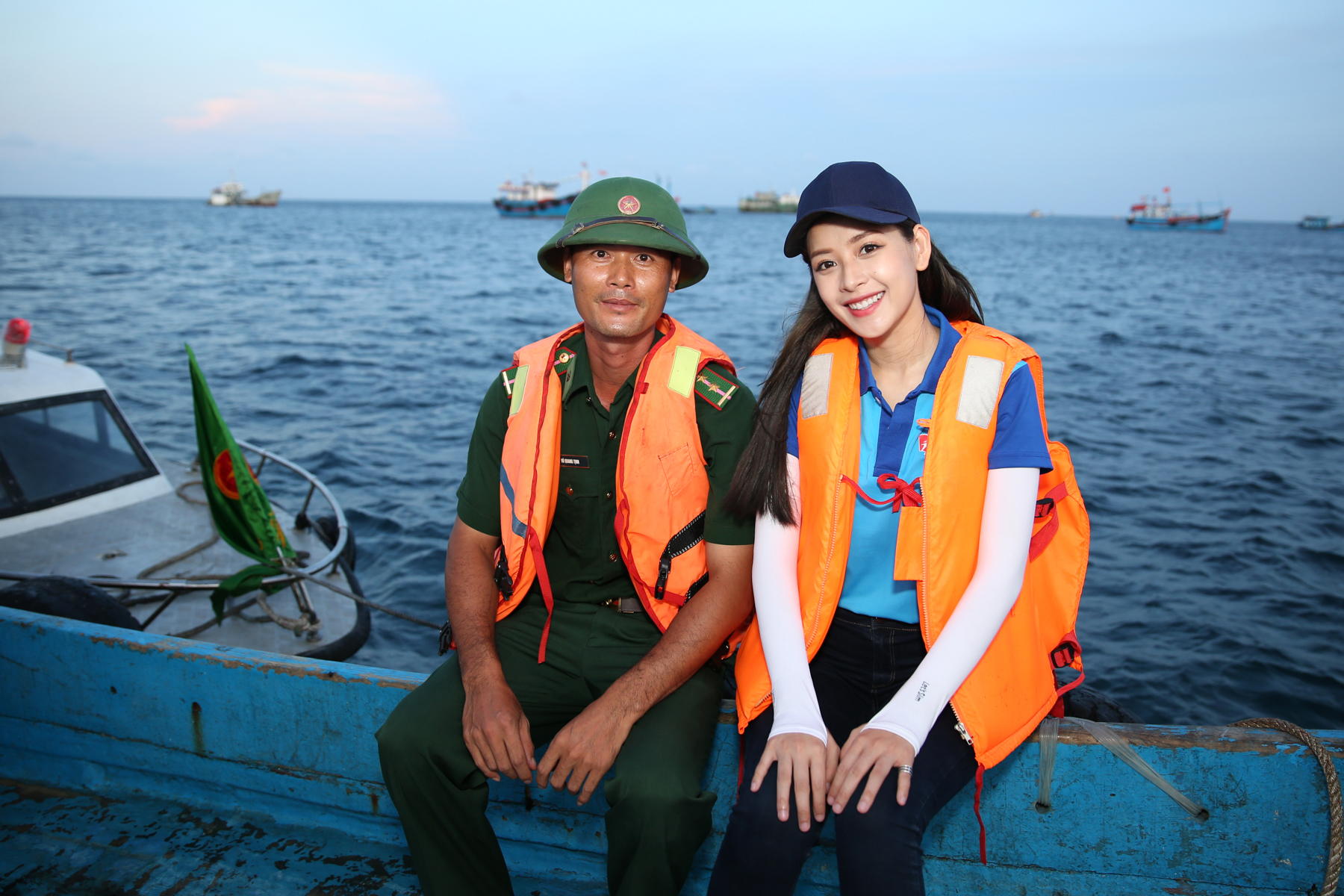 Chi Pu cùng đại diện Trung ương Hội Sinh viên Việt Nam và những thanh niên trẻ tiêu biểu đã ghé cảng, đi ca nô ra thuyền để trao tặng cờ Tổ quốc cho các ngư dân.