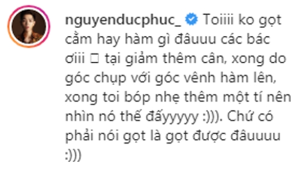Đáp lại những bình luận này, Đức Phúc nhanh chóng lên tiếng: “Ôi không gọt cằm hay hàm gì đâuuu các bác ơiii, tại giảm thêm cân, xong do góc chụp với góc vênh hàm lên, xong tôi bóp nhẹ thêm một tí nên nhìn nó thế đấyyyyy. Chứ có phải nói gọt là gọt được đâuuuu“.