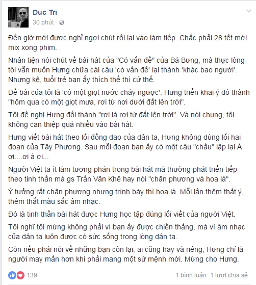 Ngoài ra, Đức Trí còn đưa ra những nhận xét riêng về bài hát của cậu học trò cưng. Nhạc sĩ cho biết ca khúc của Bá Hưng được viết theo lối đồng dao và tinh thần bài hát được triển khai đúng theo lối viết của người Việt. Cái chất âm nhạc dân gian đã được tài năng trẻ này kế thừa và phát huy một cách rất tự nhiên trong lời hát, trong giai điệu, trong kết cấu ca khúc. Đức Trí chia sẻ anh mừng vì điều đó hơn là vì chiến thắng mà Bá Hưng đạt được.