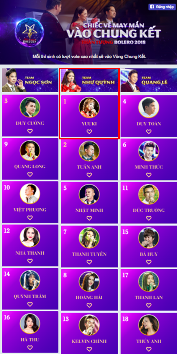 Sau đêm bán kết Thần tượng Bolero 2018, hầu hết các fan đều ngỡ ngàng khi Hoàng Hải bị loại khỏi top 3 khiến đội HLV Như Quỳnh “trống team” ngay trước vòng chung kết. Trong khi Thanh Lan - Thúy Anh của team Quang Lê và Duy Cường - học trò Ngọc Sơn đang cật lực chuẩn bị cho đêm thi cuối cùng thì các fan của ” hoa hậu bolero” chỉ còn đặt hy vọng vào bảng vote Chiếc vé may mắn.