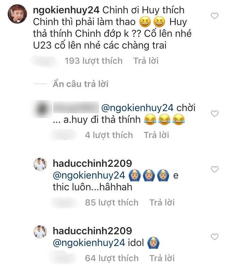 Nổi tiếng với tính cách lầy lội, Ngô Kiến Huy không ngại bình luận: “Chinh ơi, Huy thích Chinh thì phải làm sao? Huy thả thính Chinh ‘đớp’ không? U23 cố lên nhé các chàng trai”.