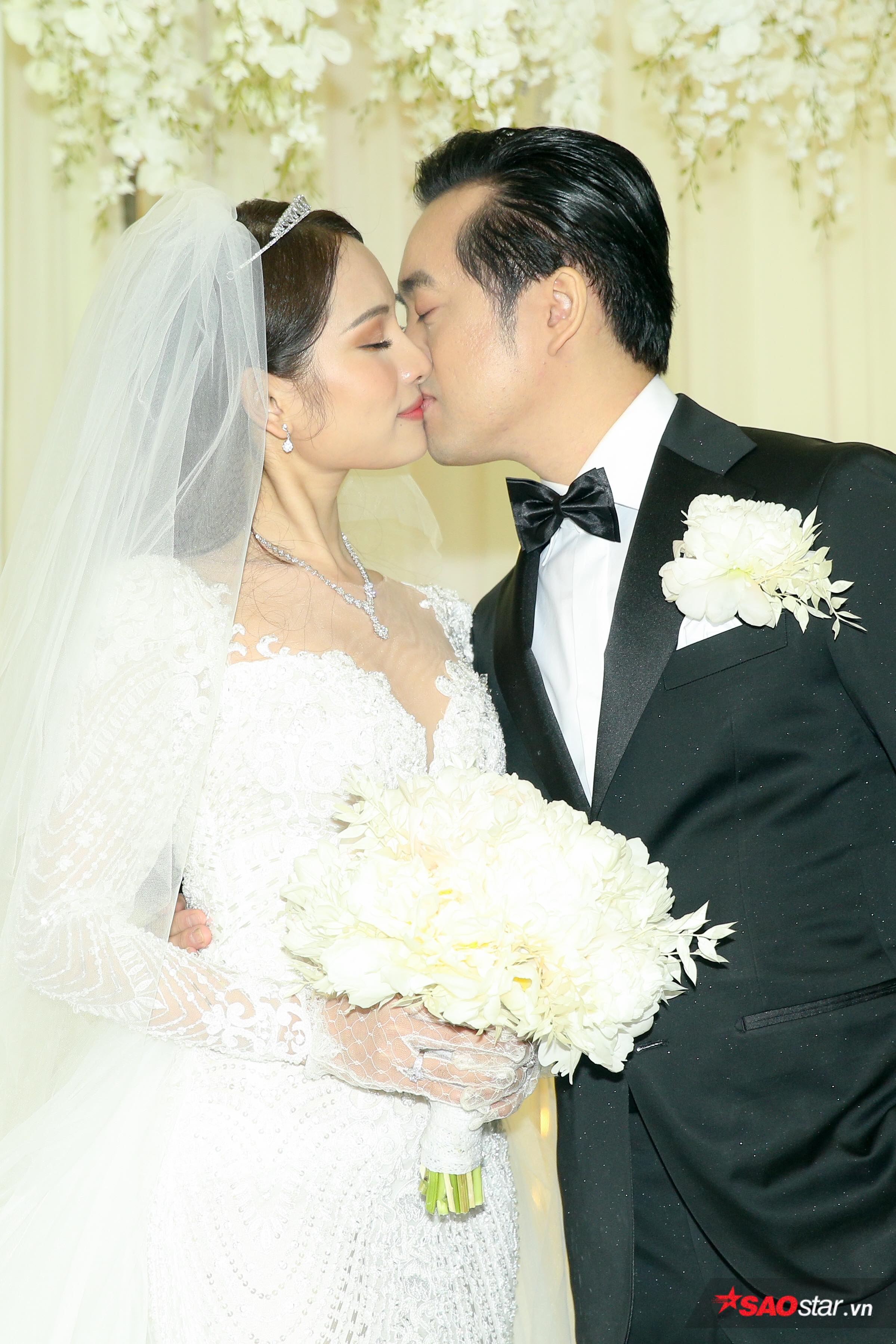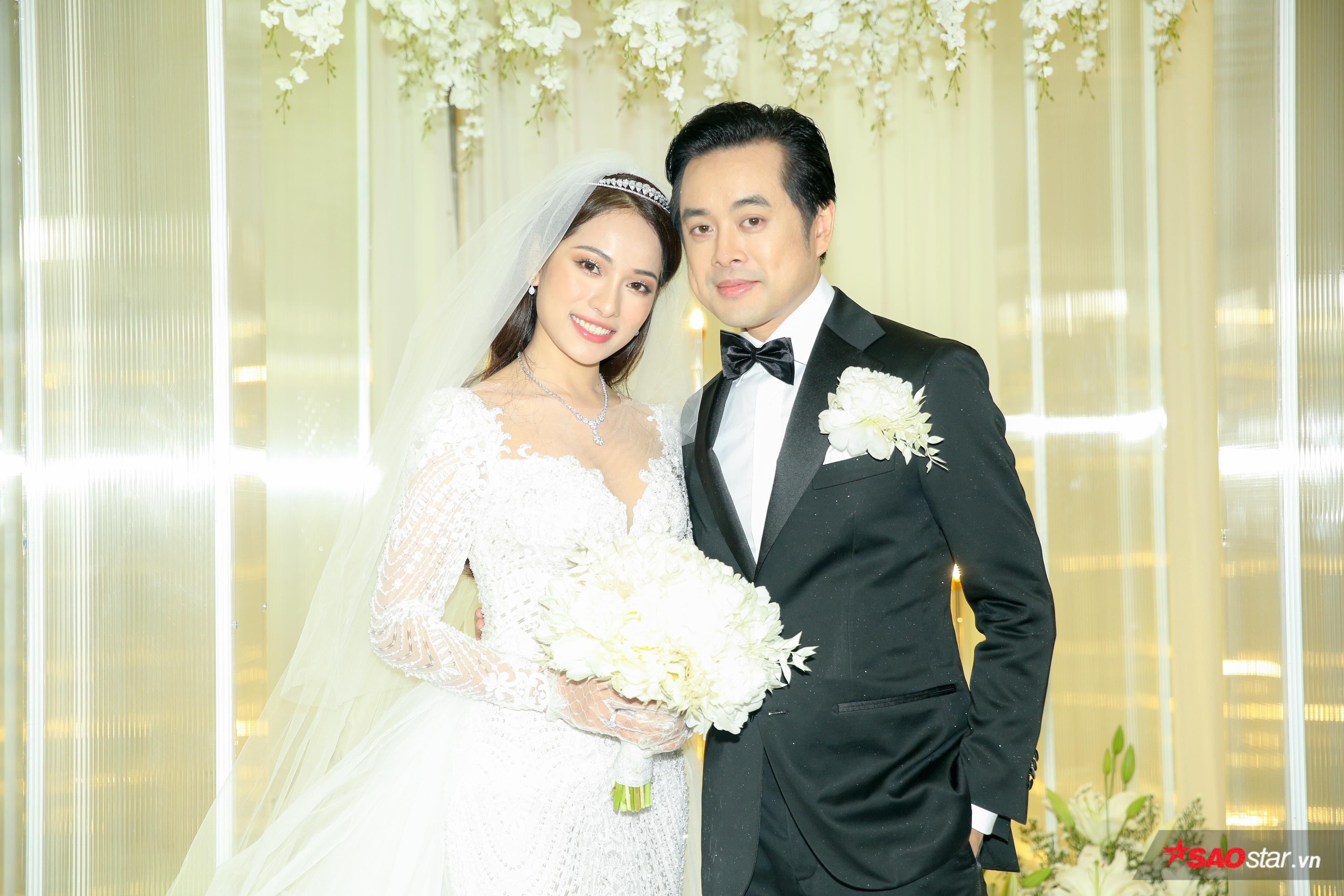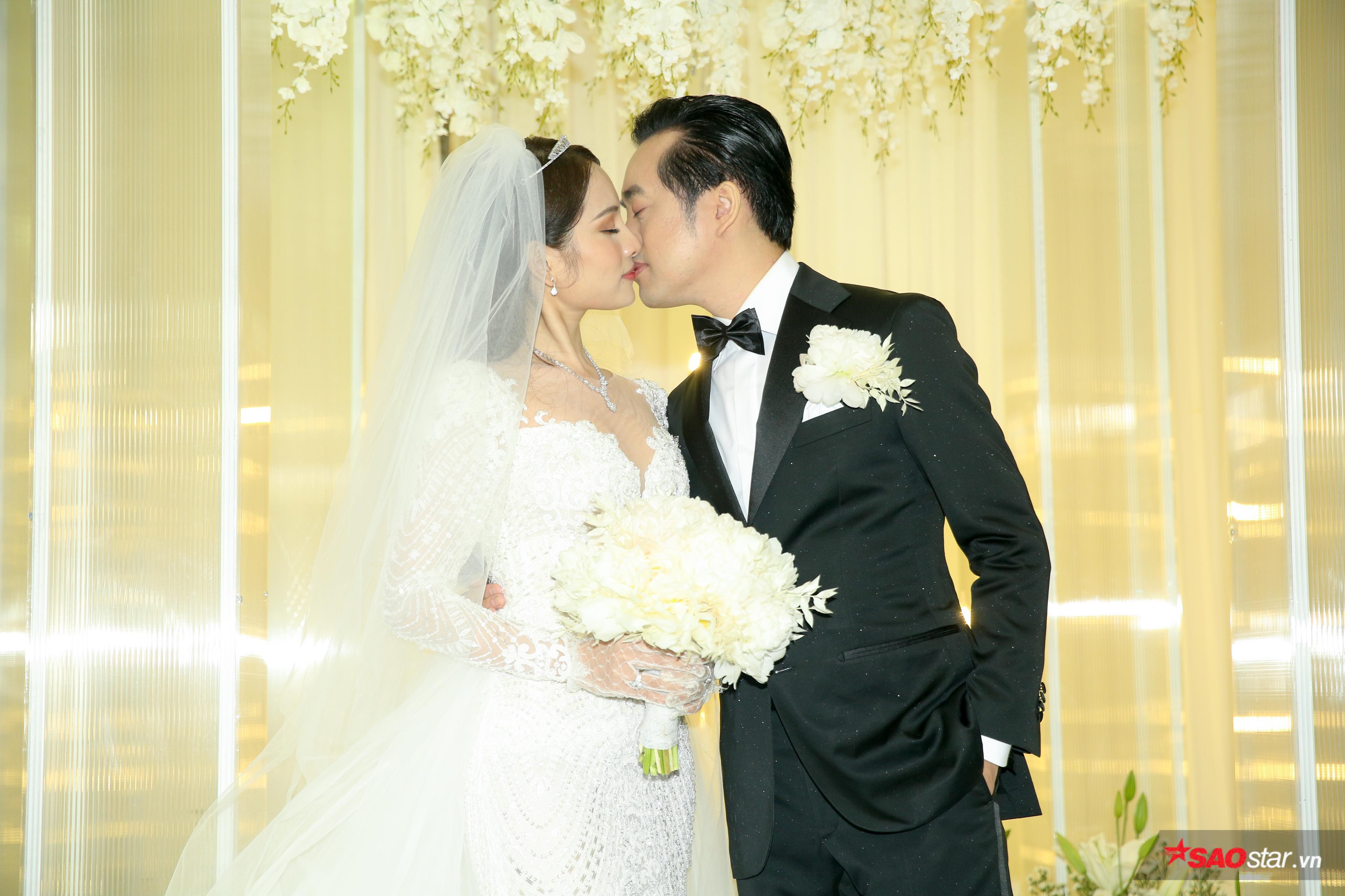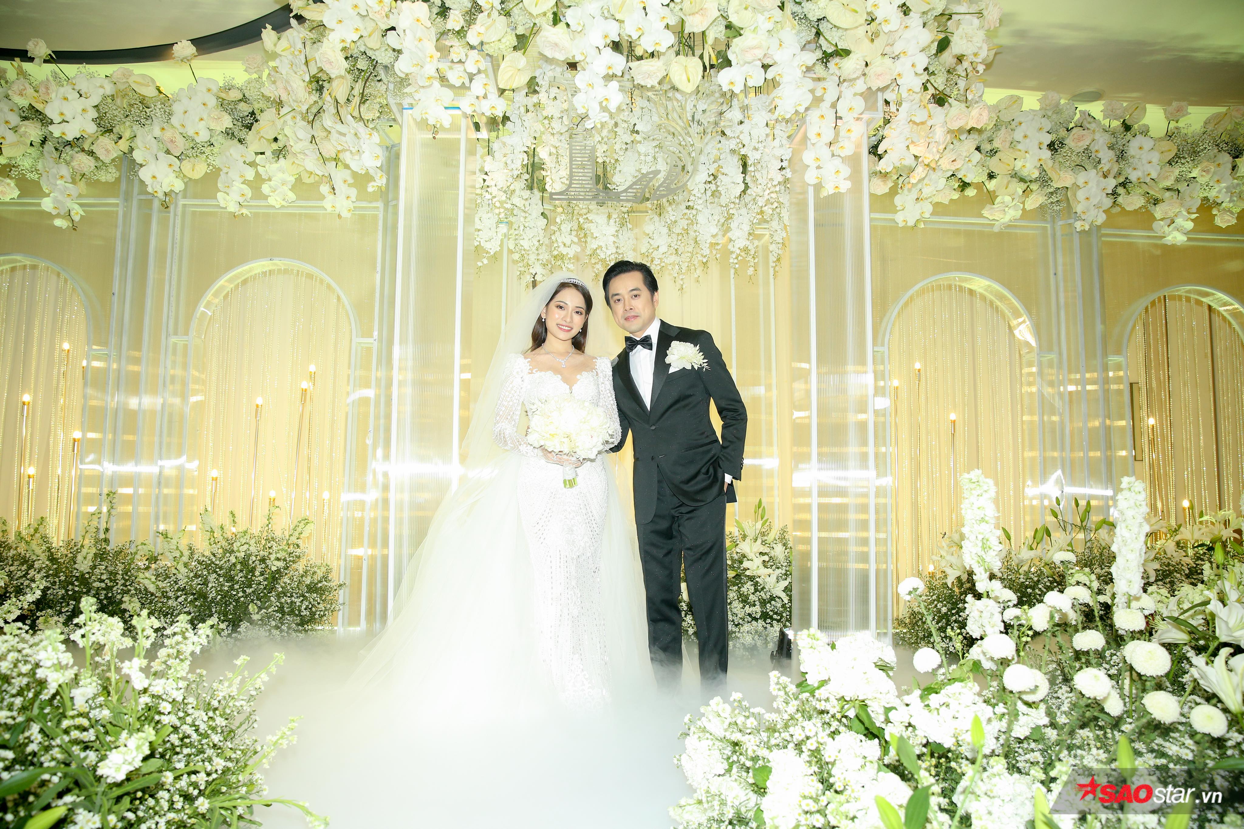 Sau buổi rước dâu đầy ấm cúng vào buổi sáng với sự chứng kiến của gia đình hai bên, lễ cưới cổ tích đã diễn ra vào buổi tối cùng ngày trong không gian sang trọng với màu trắng thuần khiết, layout thiết kế đẹp mắt.