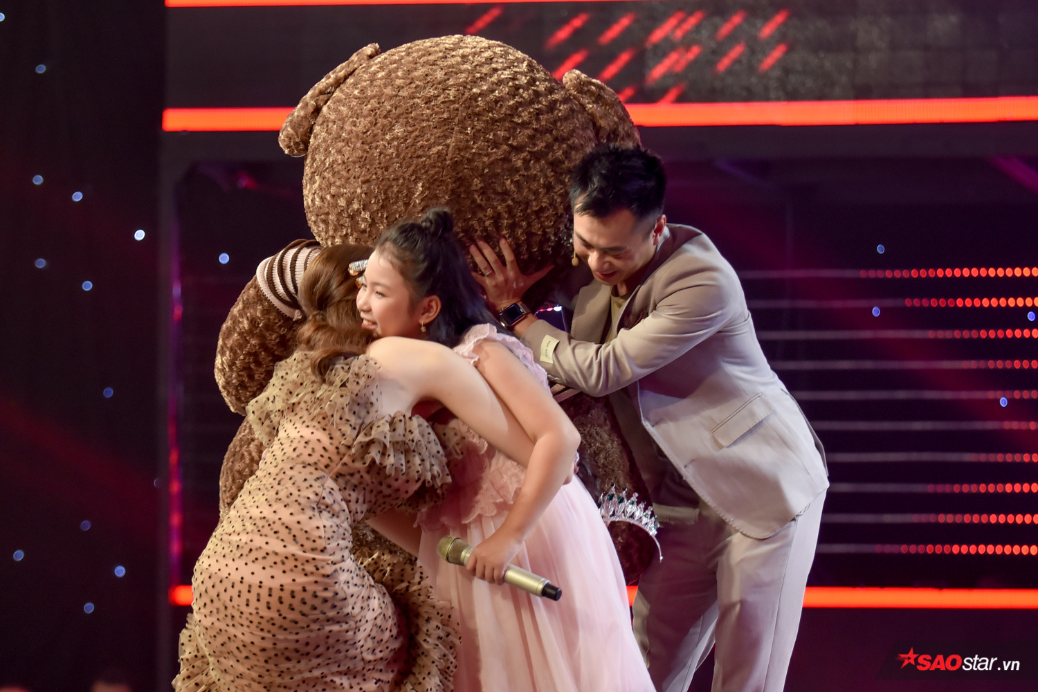 Liên tiếp sau đó, “cặp đôi nhà giàu” khiến khán giả tại trường quay thích thú khi mang một chú gấu bông “siêu to khổng lồ” lên sân khấu để chiêu dụ cô bé Khánh Vy. Chú gấu bông to đến mức trở thành điểm nhấn trên sân khấu Giấu mặt với kích thước khá lớn to gấp nhiều lần cô bé tài năng, xinh xắn.