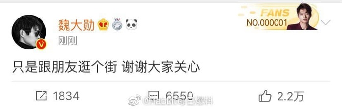 Ngay lập tức, Ngụy Đại Huân đăng bài phủ nhận, cho biết: “Chỉ là đi dạo với bạn bè, cảm ơn mọi người đã quan tâm”. Điều này chứng tỏ anh không hề bác bỏ nghi vấn người con gái kia là Dương Mịch, ám chỉ đó chính là nữ diễn viên? Dương Mịch và Ngụy Đại Huân từng là thành viên cố định trong chương trình Trốn thoát khỏi mật thất. Nàng tiểu hoa lớn hơn đối phương 3 tuổi, và cho đến hiện tại cô chưa hề lên tiếng trả lời về vấn đề tình cảm này.