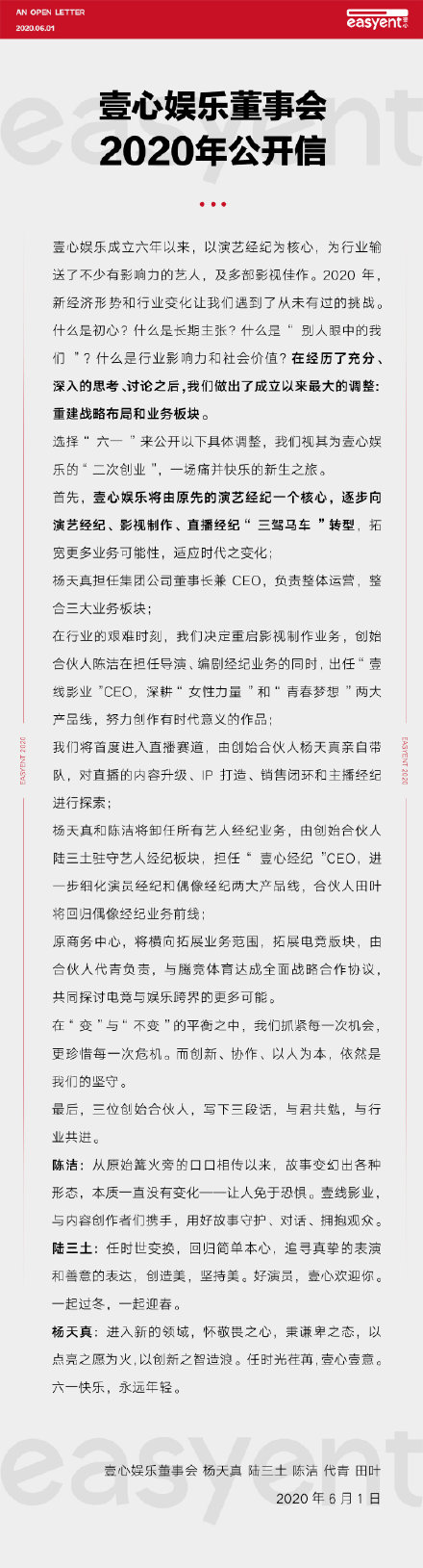 Ngày 1 tháng 6, weibo chính thức của công ty giải trí Giải trí Nhất Tâm đã công khai thư tuyên bố chuyển đổi loại hình, cho biết sẽ “sáng nghiệp lần 2”, một lần nữa xây dựng lại bố cục chiến lược và mảng kinh doanh. Từ một cái cốt lỗi sẽ dần chuyển hướng sang quản lý diễn nghệ (nghệ thuật biểu diễn), sản xuất phim ảnh và quản lý livestream, đồng thời tuyên bố Dương Thiên Chân sẽ từ bỏ nghiệp vụ quản lý tất cả nghệ sĩ.
