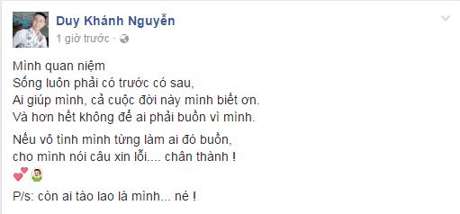 Mới đây, nam diễn viên hài Duy Khánh chia sẻ dòng trạng thái đầy ngụ ý trên trang cá nhân. Cụ thể, anh viết: “Mình quan niệm. Sống luôn phải có trước có sau. Ai giúp mình, cả cuộc đời này mình biết ơn. Và hơn hết không để ai phải buồn vì mình. Nếu vô tình mình từng làm ai đó buồn, cho mình nói câu xin lỗi chân thành! P/s: còn ai tào lao là mình… né!”.