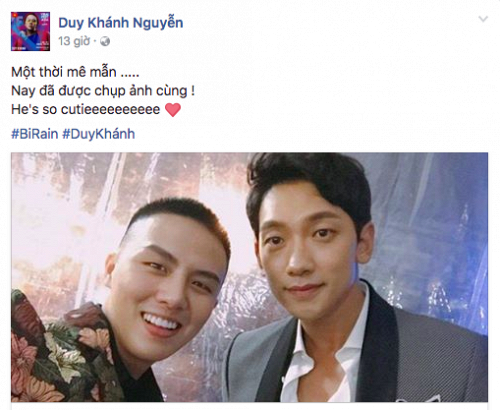 Theo đấy, sự việc diễn ra khi Duy Khánh chia sẻ hình ảnh chụp cùng với Bi Rain tại hậu trường trong khuôn khổ đại nhạc hội Viral Fest Asia 2017. Điều đáng nói ở đây là dù chụp với thần tượng nhưng anh khẳng định vẫn chỉ mê nhất Trấn Thành.