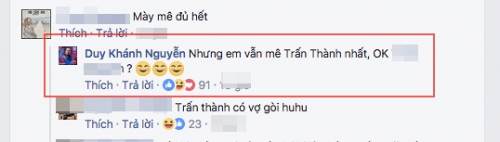 Khi một người bạn đùa rằng Duy Khánh gặp ai cũng mê, anh chàng nhanh chóng đưa ra câu trả lời hóm hỉnh: “Nhưng em vẫn mê Trấn Thành nhất…”. Câu nói của Duy Khánh ngay lập tức trở thành tâm điểm chú ý của các fan. Bởi trước đó, anh và Trấn Thành từng không ít lần vướng vào nghi vấn tình cảm.