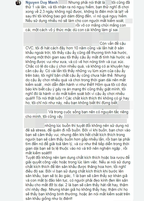 Nếu ai nói sử dụng chất kích thích để lên sân khấu được thăng hoa hơn, tồi nghĩ điều đó sai. Bởi vì bạn sử dụng chất kích thích khi bước lên sân khấu, bạn sẽ bị ảo giác, một là bạn sẽ cảm thấy sợ khán giả và con mắt bị đảo liên tục, có người phải đeo kính đen lên sân khấu cho mắt đỡ bị dại.