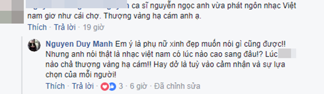 Tuy vậy, giọng ca Kiếp đỏ đen vẫn giải thích rõ lý do anh đưa ra quan điểm đồng thuận: “Nhưng anh nói thật là nhạc Việt Nam có lúc nào cao sang đâu! Lúc nào chả thượng vàng hạ cám. Hay dở tùy vào cảm nhận và sự lựa chọn của mỗi người”.