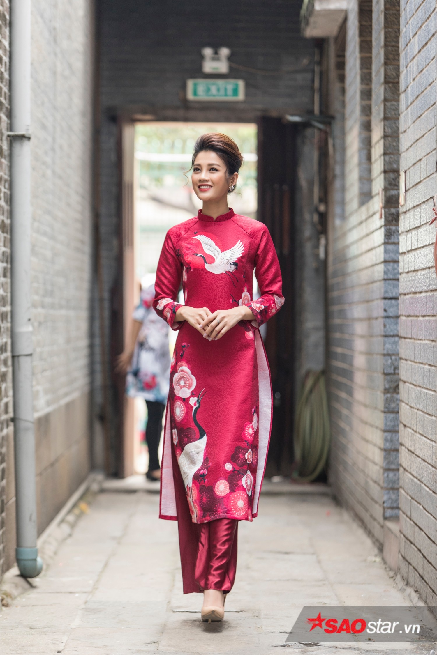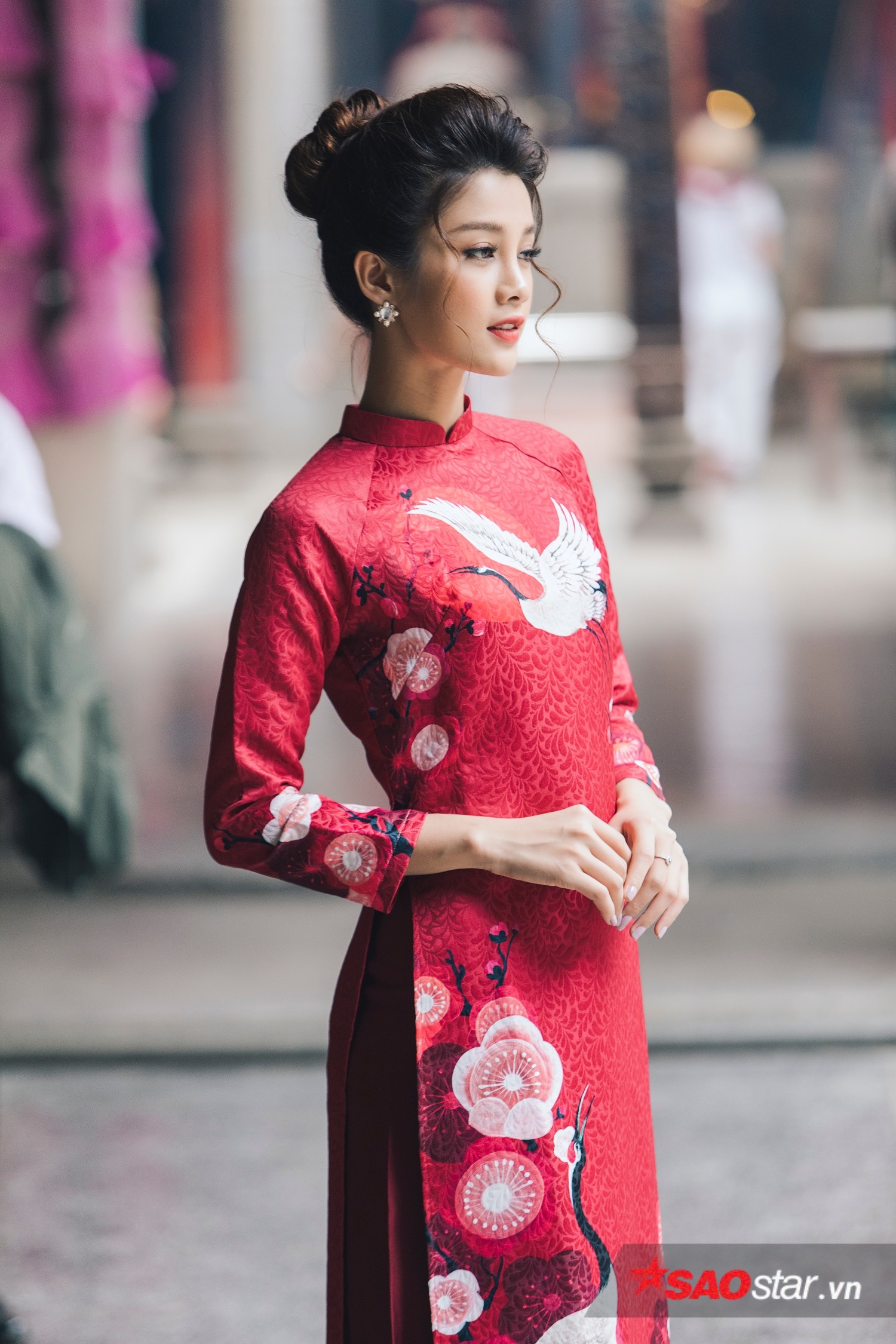 Học trò cưng Lan Khuê diện áo dài đỏ với hoạ tiết chim hạc nổi bật.
