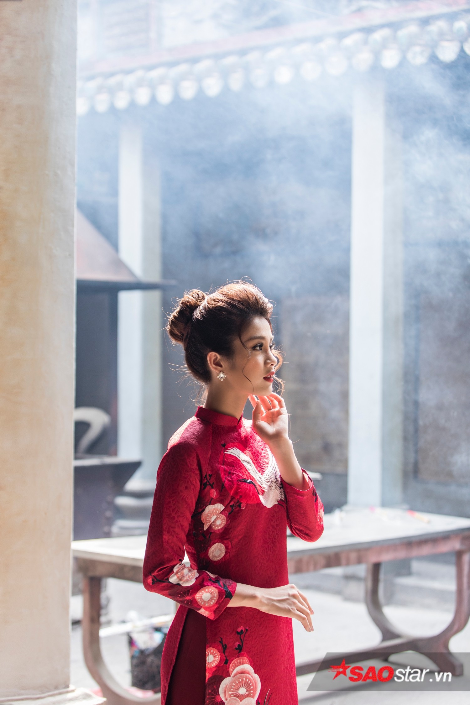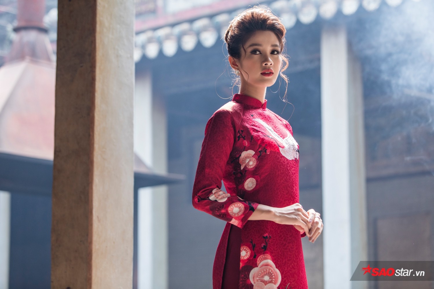 Mỹ Duyên diện áo dài đỏ rực rỡ trong bộ ảnh chào đón năm mới.