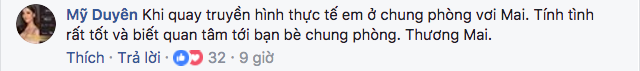 Bình luận của người đẹp xuất thân từ The Face mùa 2 nhanh chóng nhận được sự quan tâm từ khán giả. Một số cư dân mạng đều đồng tình với ý kiến của Mỹ Duyên khi lên tiếng bảo vệ Mai Ngô trước lùm xùm không tôn trọng Ban giám khảo cũng như quyết định rút tên khỏi Hoa hậu Hoàn vũ Việt Nam 2017.