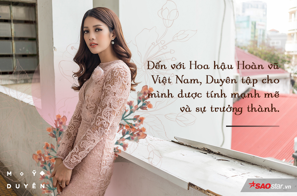 - Duyên học hỏi được rất nhiều điều sau mỗi cuộc thi mình tham gia và đó là những trải nghiệm tuyệt vời nhất trong cuộc đời của Duyên. Đến với Hoa hậu Hoàn vũ Việt Nam, Duyên tập cho mình được tính mạnh mẽ và sự trưởng thành. Trước đây, ở The Face, Duyên là một cô gái yếu đuối, rụt rè và không dám thể hiện bản thân mình nhưng đến với Miss Universe Vietnam, bản thân thấy mình trưởng thành hơn, không còn kiểu cô gái yếu đuối hay mít ướt nữa. Duyên học được kinh nghiệm, kiến thức từ cố vấn chuyên môn, từ BGK cũng như từ bạn bè xung quanh.