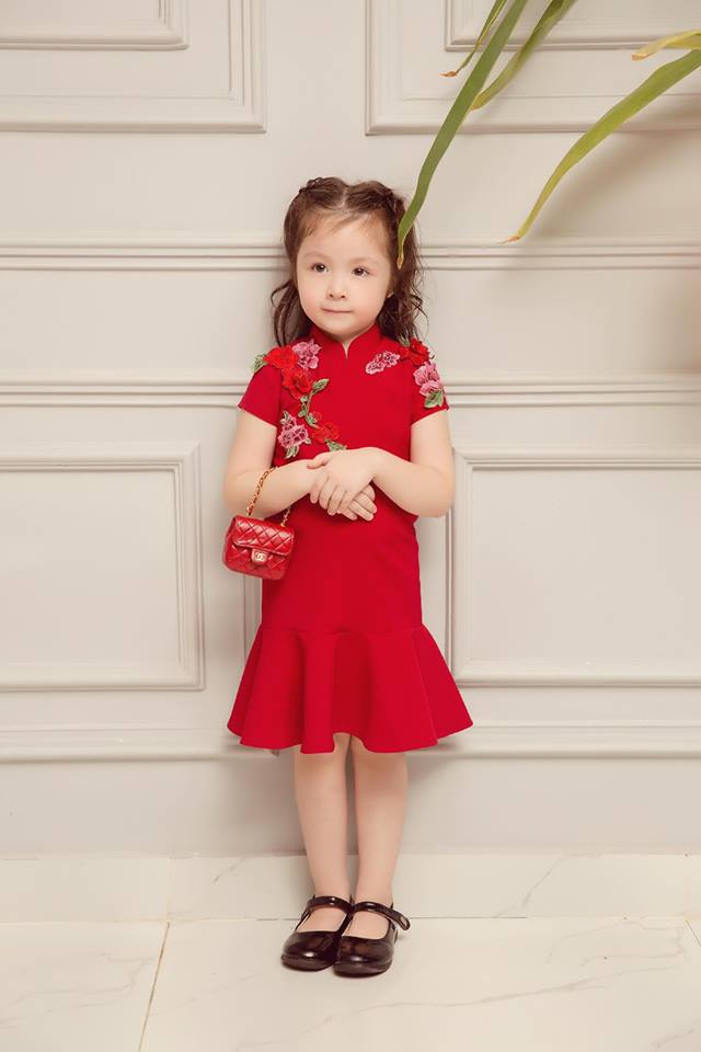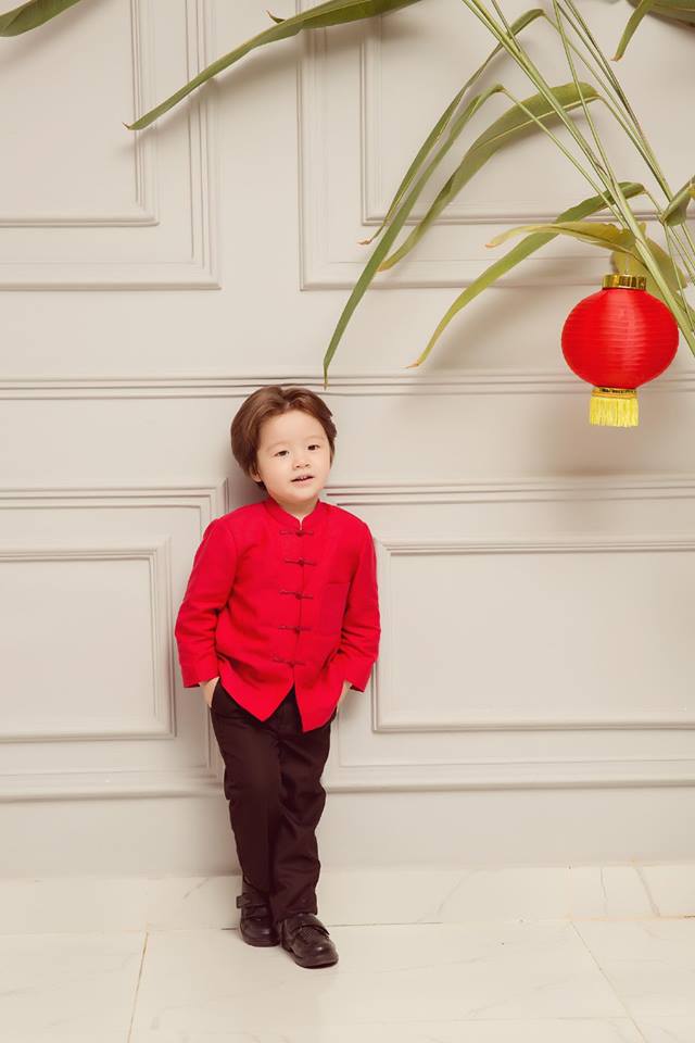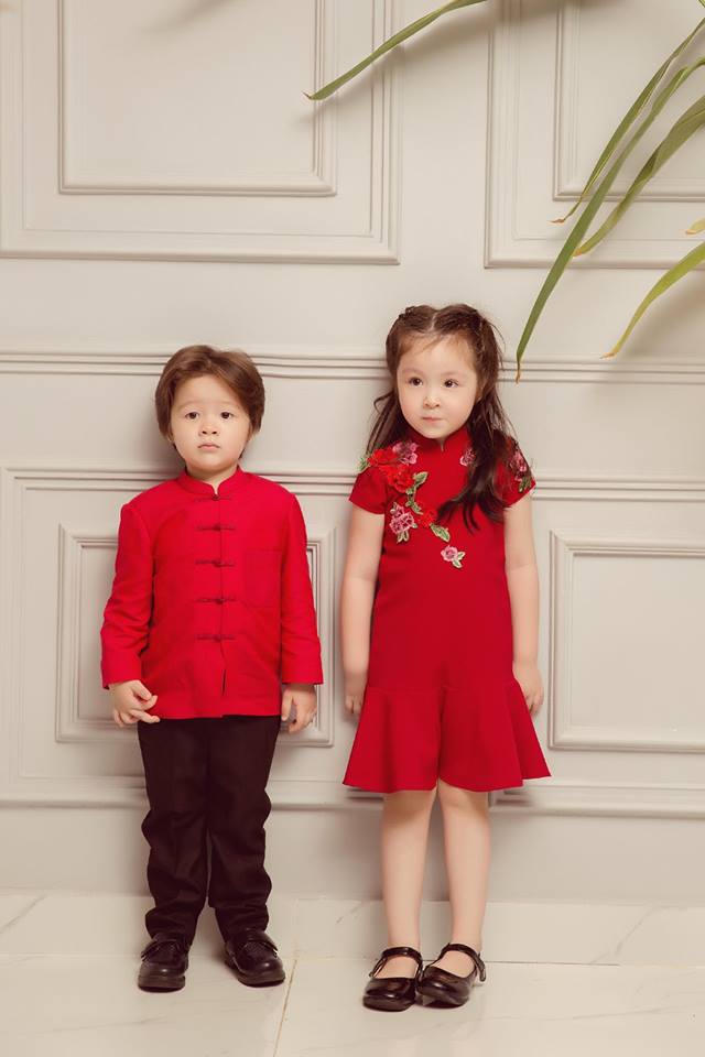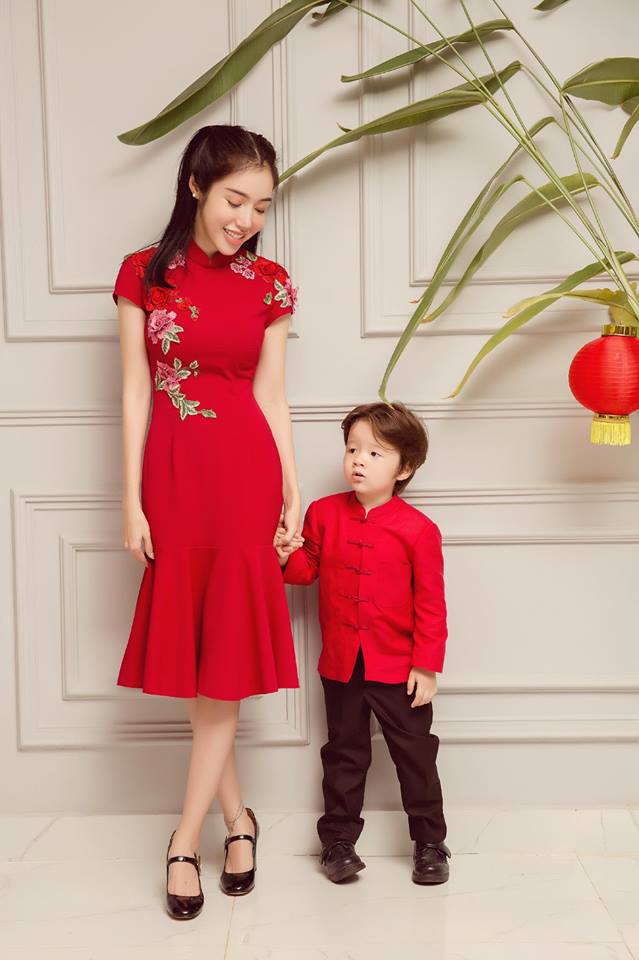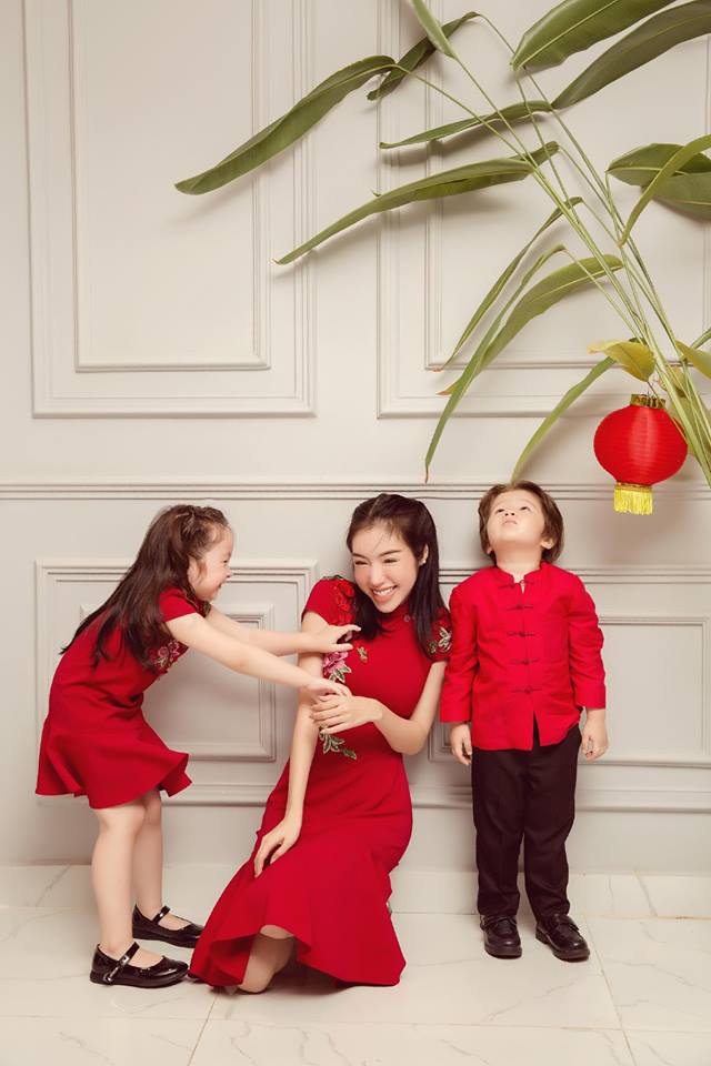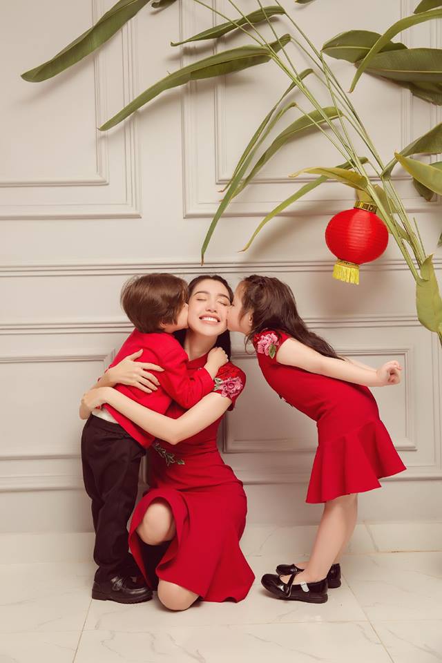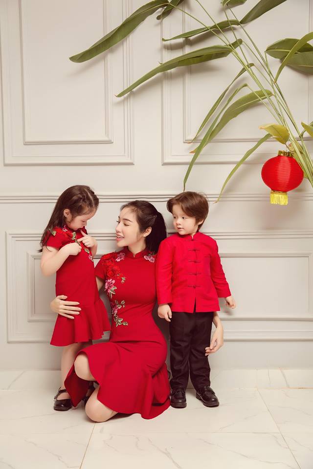Cả ba mẹ con đều xinh đẹp trong thiết kế màu đỏ ấn tượng. Màu đỏ cũng là màu may mắn. Có lẽ, mục đích thực hiện bộ ảnh này của Elly Trần mong muốn rằng gia đình cô sẽ gặp nhiều may mắn.