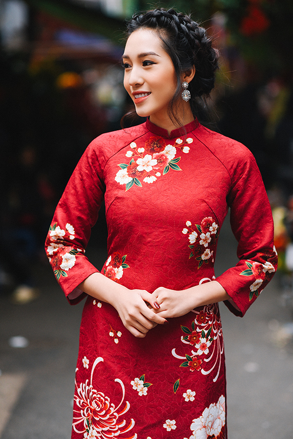 Nữ ca sĩ duyên dáng trong tà áo dài đỏ.