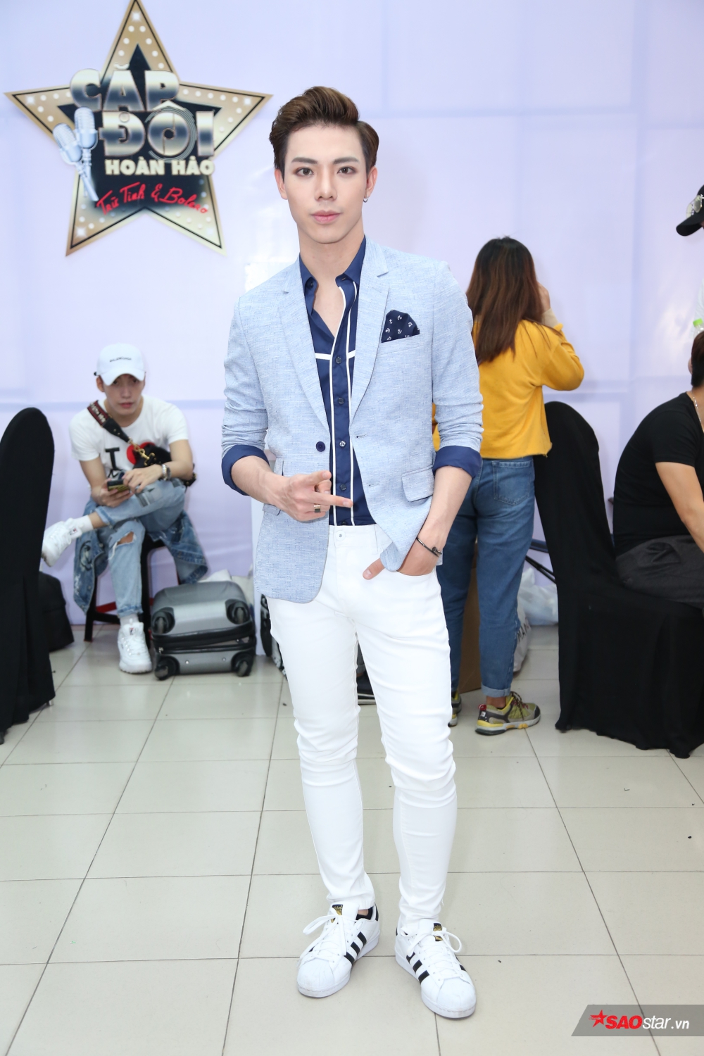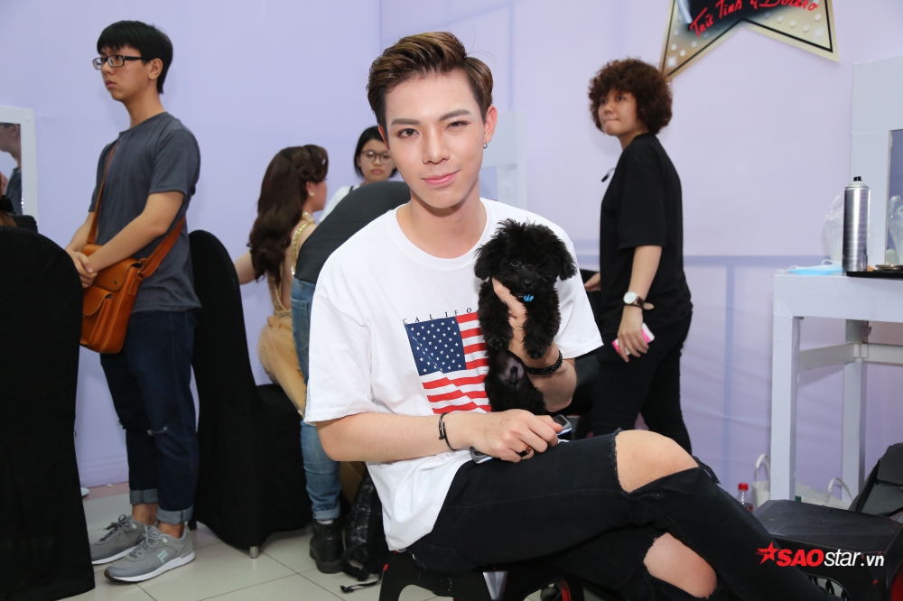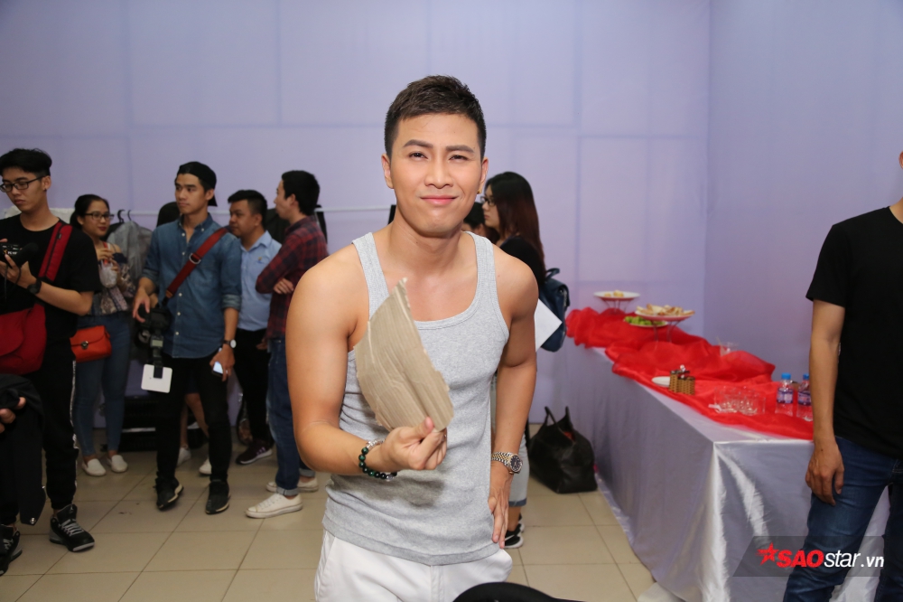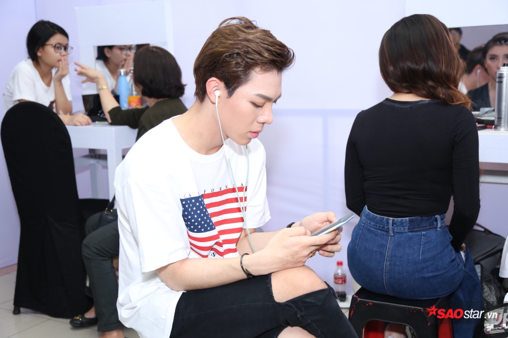 Đức Phúc đến từ khá sớm, cậu tranh thủ chỉn chu lại makeup trước sức nóng từ nhà thi đấu.
