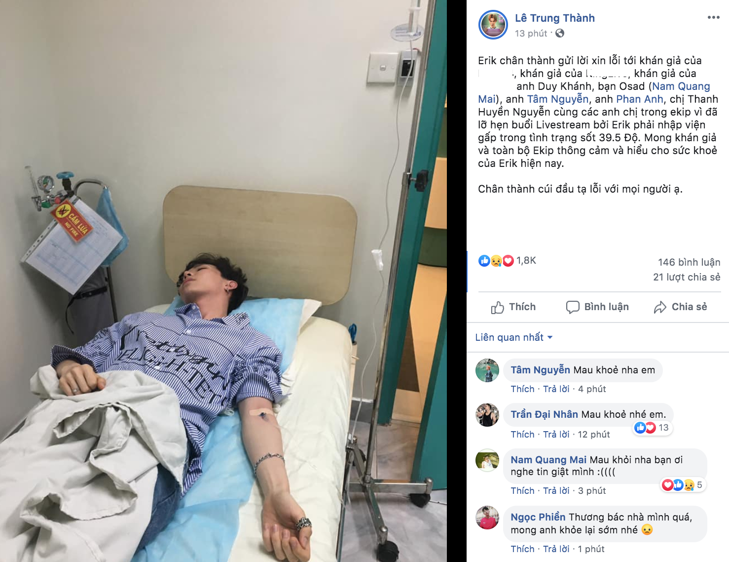 Theo đó, giọng ca Chạm đáy nỗi đau vẫn còn đang mặc trang phục đi diễn, thậm chí đã make up sẵn sàng. Được biết, Erik sẽ có một buổi giao lưu trực tuyến cùng khán giả ngay trong tối nay. Thế nhưng vì tình trạng sức khoẻ không ổn định, anh chàng đã phải ngay lập tức nhập viện và tạm dời buổi giao lưu.
