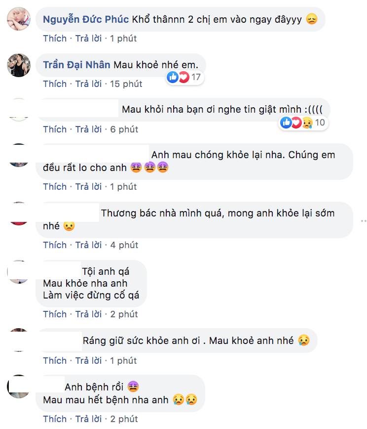 Dưới phần bình luận, ca sĩ Đại Nhân, Đức Phúc và nhiều fan đã vô cùng lo lắng cho bệnh tình của nam ca sĩ và dành nhiều lời động viên đến anh.