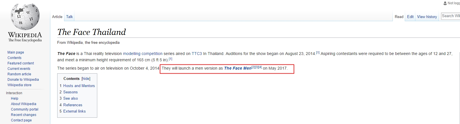 Ngoài ra, trang Wikipedia cũng chia sẻ một số thông tin chưa chính thức The Face Men Thailand rằng chương trình sẽ được sản xuất và lên sóng trên kênh TTC3 (chamnel 3) vào tháng 5 tới.