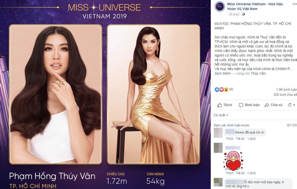 Sau thời gian được fan ủng hộ nhiệt tình, Á hậu 3 - Hoa hậu Quốc tế 2015 -Thúy Vân đã chính thức ghi danh tham gia cuộc thi Miss Universe Vietnam Online nằm trong khuôn khổ Hoa hậu Hoàn vũ Việt Nam 2019. Hình ảnh giới thiệu thông tin của Thúy Vân vừa được đăng tải đã nhận được lượng tương tác yêu thích và chia sẻ “khủng”: 10 phút thu hút hơn 3 nghìn like và hơn 500 lượt share.