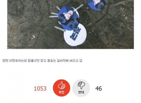 4. [+105, -17] Lớp học của các em Army ㅋㅋ Trong tất cả những đứa trẻ dành thời gian theo dõi thần tượng nổi tiếng, tôi chưa bao giờ thấy bất cứ ai biết suy nghĩ. Thật tốt khi xem thần tượng trên TV và nghĩ rằng họ thật tuyệt hoặc nghe nhạc của họ trên các trang web phát trực tuyến. Nhưng mà, các em phải biết rằng mình cũng cần biết cách ứng xử khi tham gia một buổi off fan chứ. Chỉ có những kẻ ngốc nghếch mới xả rác như thế này và than vãn về việc sasaeng fan bị ngược đãi
