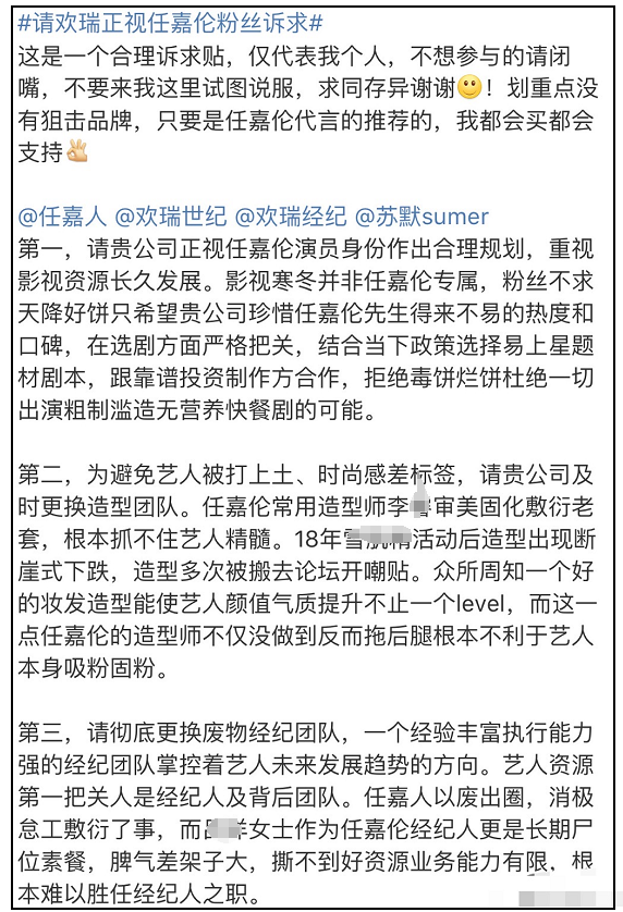 Trước mắt, fan hâm mộ Nhậm Gia Luân đăng tải bài viết dài trên mạng xã hội, đưa ra ba yêu cầu chính với Hoan Thụy. Thứ nhất, hy vọng công ty nên xem trọng Nhậm Gia Luân. Thứ hai, yêu cầu Hoan Thụy đổi đoàn đội stylist, và cuối cùng yêu cầu công ty đổi đoàn đội quản lý. Đặc biệt là phải đổi đoàn đội stylist vì fan chỉ ra tạo hình của Nhậm Gia Luân không hề có chút đặc sắc nào, không thể hiện được những đặc điểm nổi bật của thần tượng.