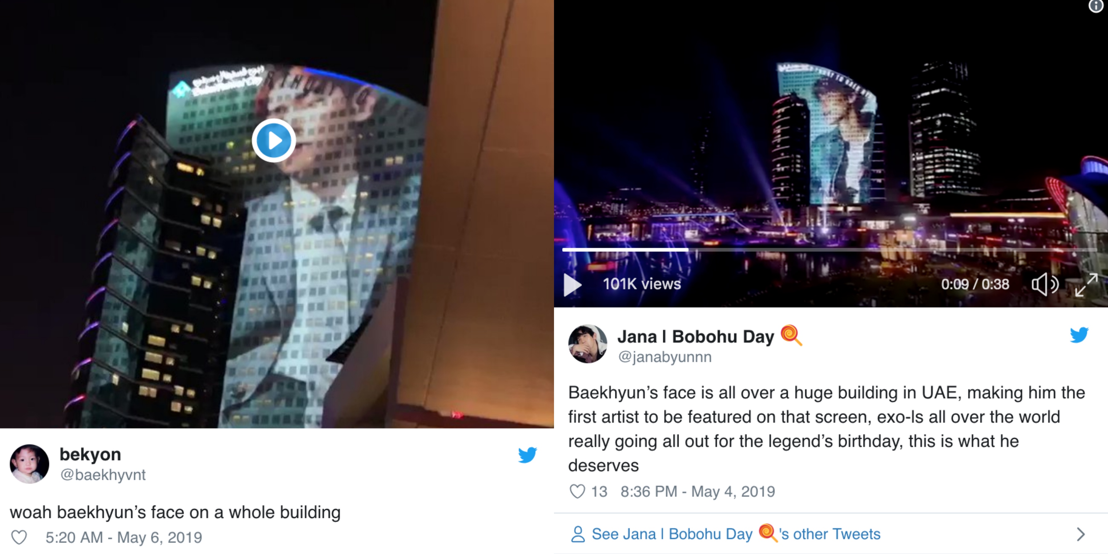 Theo đó, một video biểu diễn vô cùng ấn tượng của Baekhyun đã được phát tại màn hình khổng lồ của trung tâm thương mại Dubai Festival City. Được biết, màn chuẩn bị hoành tráng này được tổ chức bởi hội người hâm mộ Baekhyun tại Trung Quốc để thể hiện tình yêu không chỉ cho Baekhyun mà còn cho các EXO-L tại Ả Rập.