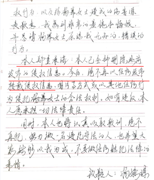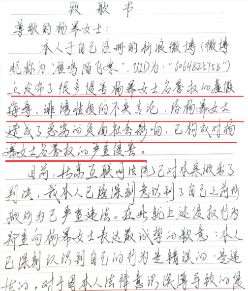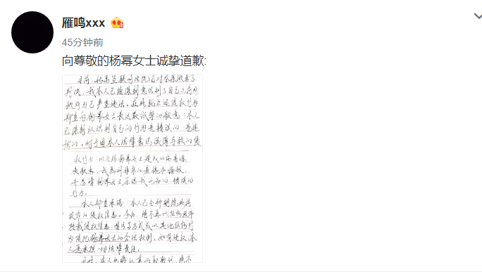 Hôm nay (21.04), một tài khoản có tên Nhạn Minh XXX đã đăng bài viết với hình ảnh thư viết tay gửi lời xin lỗi đến Dương Mịch. Lá thư chủ yếu bày tỏ thời gian trước, người này đã nhiều lần lên tiếng xúc phạm, phỉ báng, nói sai sự thật, vi phạm nghiêm trọng quyền danh dự của Dương Mịch, gây ra tác động xấu và tiêu cực đến nữ diễn viên. Trước mắt, pháp viện Bắc Kinh đã ra phán quyết tuyên bố Dương Mịch thắng kiện, buộc bị cáo với tài khoản Nhạn Minh XXX đăng bài xin lỗi nàng tiểu hoa.