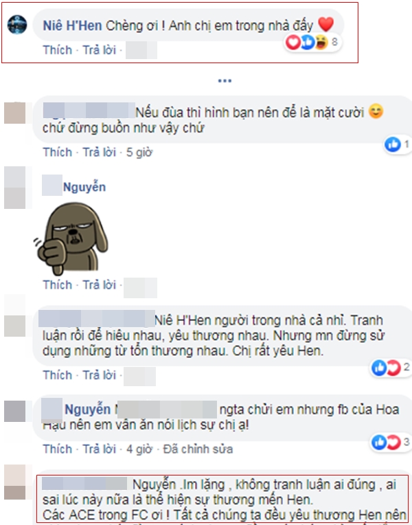 Tuy vậy, người đẹp Ê Đê bất ngờ có cách giảng hòa khéo léo khiến các fan tâm phục khẩu phục và “ngừng khẩu chiến”. Cô nàng để lại bình luận đáng yêu nhưng lại là lời nhắc nhở nghiêm túc: “Chèng ơi! Anh chị em trong nhà đấy“. Cuối cùng, chính các fan của H'Hen Niê - những “anh chị em” như lời cô nàng khẳng định đã khuyên nhau “chuyện nhỏ bỏ qua”.