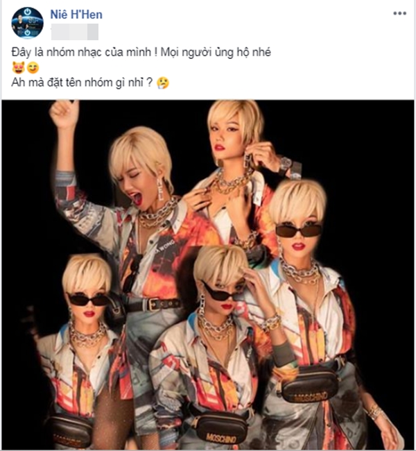Chia sẻ hình ảnh của bản thân với nhiều khoảnh khắc thần thái khác nhau, H'Hen Niê hóm hỉnh đặt câu hỏi với các fan trên trang cá nhân: “Đây là nhóm nhạc của mình. Mọi người ủng hộ nhé. Mà đặt tên nhóm gì nhỉ?”. Bên cạnh nhiều bình luận để lại lời khuyên H'Hen Niê cách đặt tên nhóm nhạc và hứng thú vì cô nàng từng chia sẻ muốn thử sức tham gia một cuộc thi ca hát lại có bình luận khiến chính cộng đồng fan của Top 5 Miss Universe 2018 tranh cãi nội bộ: “Đúng là thời bây giờ cầm micro lên là ca sĩ, hát dở như bà mà cũng lập được nhóm nhạc“.