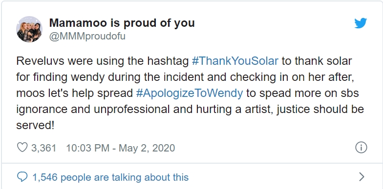 Để tỏ ra thái độ của mình, mới đây, cộng đồng Reveluvs đã đồng loạt đăng hashtag #ThankyouSolar để cảm ơn thành viên Solar của MAMAMOO vì đã tìm thấy Wendy sau tai nạn tại sân khấu tập duyệt SBS Gayo Dejun. Qua đây, fan muốn bày tỏ sự thất vọng đối với cách xử lý vấn đề của SM và bức xúc, ghê tởm đối với SBS.