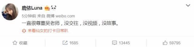 Ngày 31 tháng 8, đối mặt với những tin đồn trên mạng thì bản thân Lộc Y cũng đã đích thân lên tiếng phủ nhận: “Luôn rất tôn trọng Ngô lão sư, không qua lại, không có video”, đồng thời cho biết người trong video không phải là cô. Cho dù như thế nhưng đa số dân mạng đều bày tỏ không tin, ngược lại nghi ngờ Lộc Y bày trò “hám fame” để lên hot search.