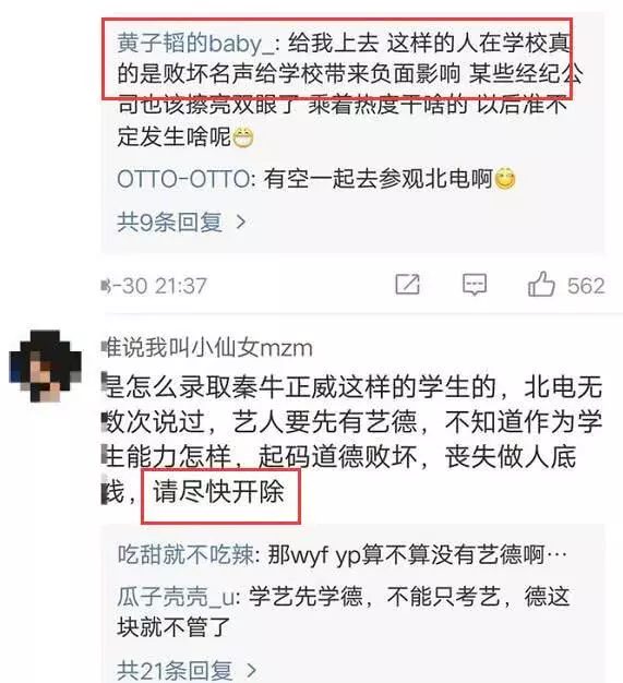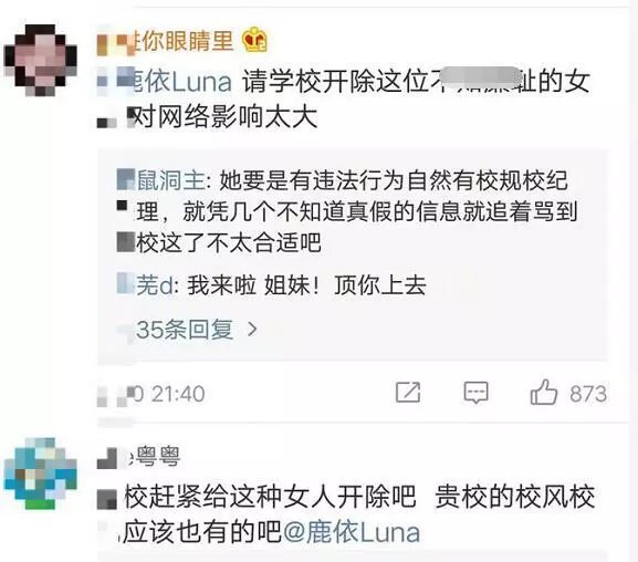 Vì vậy, không ít cư dân mạng lần lượt phản đối, để lại bình luận: “Xin trường học khai trừ”, “Xin quý trường học mau chóng khai trừ loại con gái như thế này”, “Xin mau chóng khai trừ”... thể hiện sự bất mãn của mình với Lộc Y, hy vọng Học viện điện ảnh Bắc Kinh mau chóng đuổi học cô.