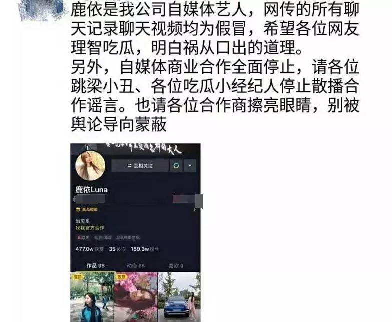 Đối với tin đồn trên mạng lần này thì công ty quản lý cũng lên tiếng cho biết sẽ ngừng toàn bộ công việc của Lộc Y, đồng thời hy vọng mọi người ngừng lan truyền những tin đồn khác nhau. Đối với hành động ngừng toàn bộ công việc của Lộc Y có lẽ cũng không muốn cô bị những người ác ý cố tình tung tin đồn bậy, cũng muốn kịp thời ngăn chặn những tranh luận từ thế giới bên ngoài.