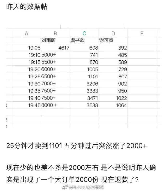 Tiếp đến, lượng tiêu thụ của sản phẩm lại đột nhiên tăng lên, cư dân mạng bày tỏ nghi ngờ là do Ngu Thư Hân đích thân mua. Fan hâm mộ cũng tag tên weibo Ngu Thư Hân, muốn cô đừng gây chuyện nữa. Động thái bất ngờ này dấy lên nghi vấn phải chăng do fan hâm mộ trả hàng: “Cái này cũng bí ẩn ghê”, “Thao tác bí ẩn này phải chăng là do fan hâm mộ trả hàng?, “Cái đoàn đội này cũng kỳ lạ ghê”…