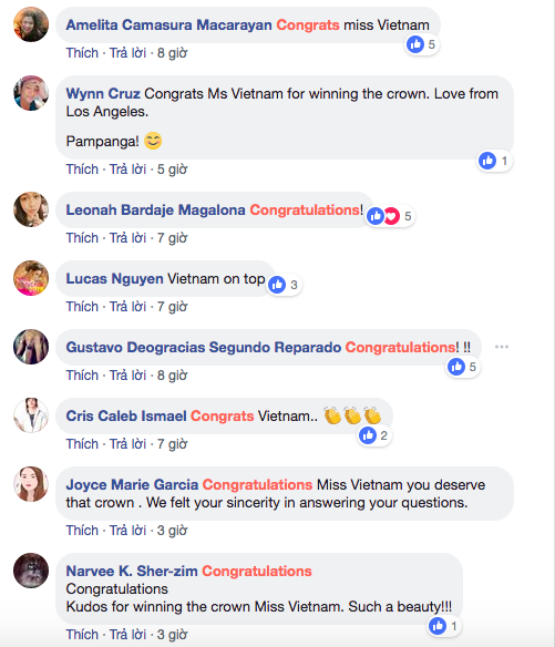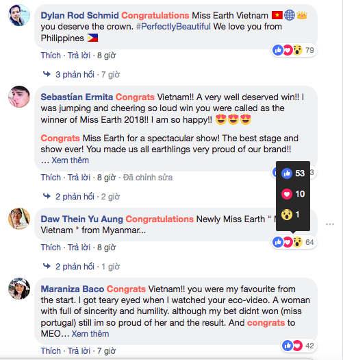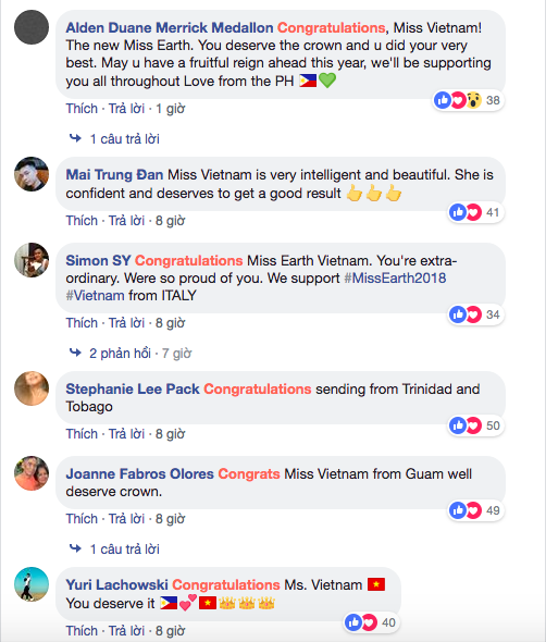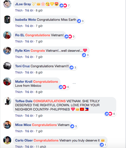 Nhiều khán giả cho rằng: “Việt Nam hoàn toàn xứng đáng”, “ngàn tình yêu gửi đến Việt Nam”, “Việt Nam là tân Hoa hậu Trái đất, điều đó hoàn toàn thuyết phục, bạn đã làm rất tốt“, “Hoa hậu Việt Nam rất đẹp và thanh lịch, cô ấy tự tin và xứng đáng với kết quả tuyệt vời này”, “chúc mừng Việt Nam, bạn là một trong những người đẹp yêu thích của tôi ngay từ mới bắt đầu, bạn hoàn toàn xứng đáng với chiếc vương miện này”,…