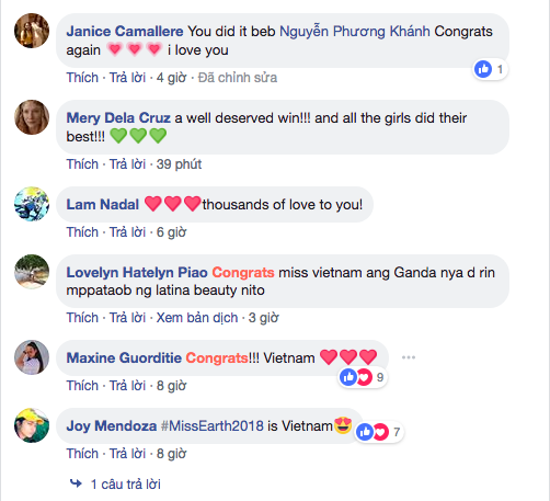 Ở trên mạng xã hội, dưới bức hình của Phương Khánh BTC cuộc thi đăng lên, hầu hết các khán giả quốc tế đều vào chúc mừng, họ gọi tên Việt Nam kèm theo những lời chúc đến Tân Hoa hậu Trái đất Nguyễn Phương Khánh. Có thể nói, chiến thắng của Phương Khánh là một chiến thắng hoàn hảo từ khoảnh khắc đăng quang đẹp cho đến khán giả khắp nơi trên thế giới theo dõi cuộc thi đều bị thuyết phục trước chiến thắng xứng đáng của Phương Khánh.