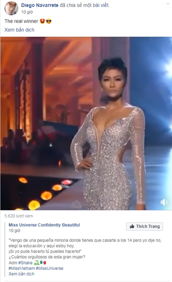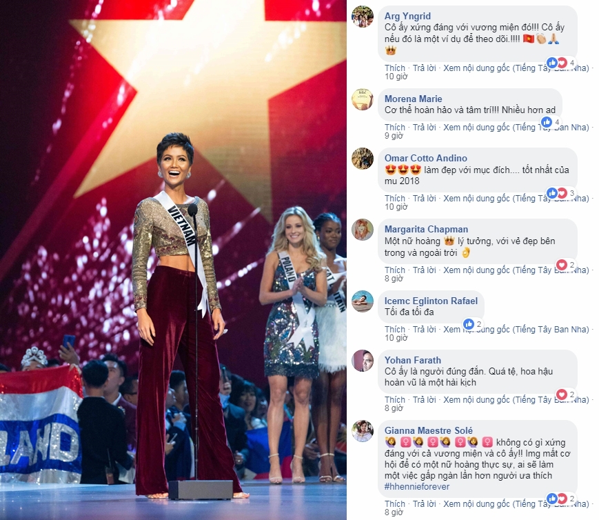 Ngay lập tức, có hàng loạt bình luận của các fan Tây Ban Nha cho rằng H'Hen Niê xứng đáng với vương miện Miss Universe 2018 như “Cô ấy chính là Hoa hậu Hoàn vũ”, “Vẻ đẹp hoàn hảo cả về hình thể và tâm hồn”, “Cô ấy xứng đáng với vương miện đó“…
