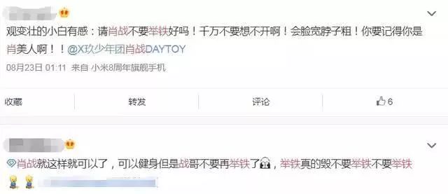 Nhìn thấy nhiều thần tượng bị suy giảm nhan sắc và khí chất khi luyện tập thể hình, fan hâm mộ bắt đầu cảm thấy lo lắng. Khi họ vừa nghe tin Tiêu Chiến bắt đầu tập cử tạ, nhiều người lần lượt đăng bài khẩn cầu, mong anh suy nghĩ lại và đừng động vào thứ này.