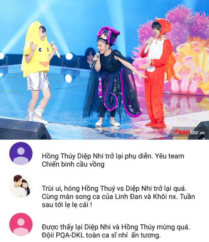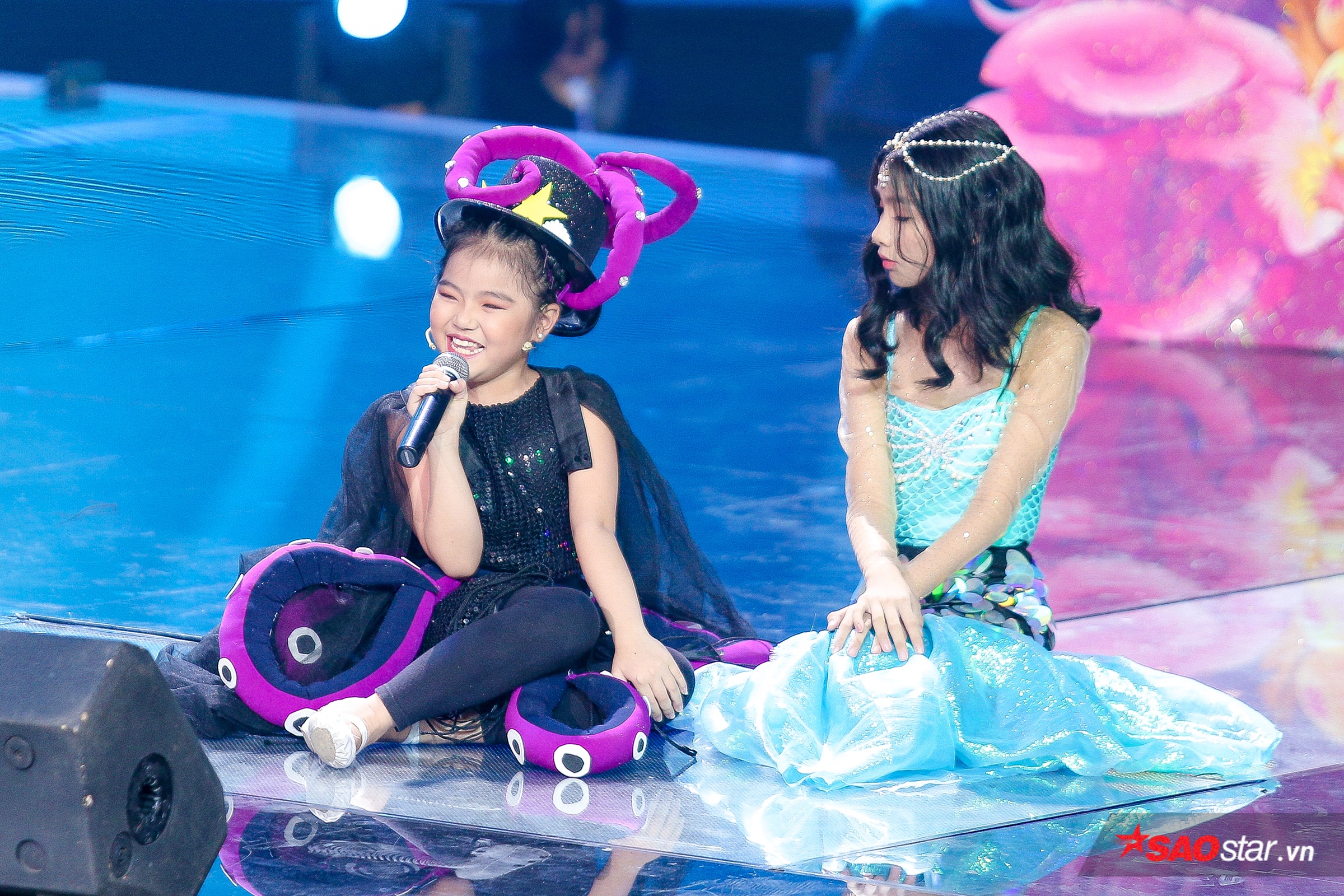 Tiết mục được các fan mong chờ nhất chính là màn song ca của 2 nhân tố nút chặn Vũ Linh Đan và Nguyễn Đức Khôi. Vào vai nàng tiên cá mạo hiểm đổi tiếng hát lấy đôi chân, Linh Đan sẽ có màn tung hứng đáng yêu cùng cậu bạn Đức Khôi. Phần hòa giọng lần đầu tiên của 2 gương mặt nổi bật nhất team Phạm Quỳnh Anh - Dương Khắc Linh dù chưa lên sóng đã khiến hàng loạt khán giả đồng loạt bình luận: “Chắc chắn nghe mãi không chán”.