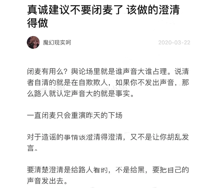 Thế nhưng, có fan chọn cách im lặng, âm thần ủng hộ cho thần tượng, làm việc người hâm mộ nên làm, không mang thêm phiền phức tới cho nghệ sỹ thì cũng có rất nhiều người kích động. Gần đây, họ lên tiếng cho biết: “Đây là lúc nên phản kích lại rồi!”. Theo lý luận của những fan hâm mộ này thì việc im lặng trên mạng cản bản không có tác dụng vì trong giới tranh luận kẻ nào to mồm hơn kẻ đó có lý. Tất nhiên, cách tốt nhất để thanh minh cho Tiêu Chiến là lên tiếng thay anh thông qua các trang mạng.