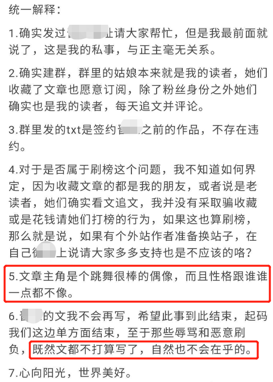 Sau khi bị ném đá, fan hâm mộ này mới phân bua, giải thích nội dung câu chuyện không hề dựa trên Tiêu Chiến. Những người trong nhóm chat được kêu gọi ủng hộ chỉ là độc giả bình thường không phải fan Tiêu Chiến, nên không có chuyện cố tình đẩy cao, PR trá hình thần tượng. Người này bày tỏ sẽ không tiếp tục viết thêm nữa và hy vọng mọi chuyện tiêu cực này sẽ được dừng lại ở đây!