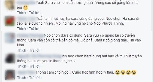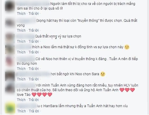 Tưởng chừng HLV Noo Phước Thịnh sẽ quyết định đưa Tuấn Anh đi tiếp vào vòng trong thì nam ca sĩ lại bất ngờ lựa chọn Han Sara tiếp tục đồng hành. Giải thích về sự lựa chọn gây sốc của mình, nam ca sĩ chia sẻ muốn cho Han Sara cơ hội để thử thách bản thân vì cô bé vừa có khả năng về giọng hát, vừa thu hút truyền thông.