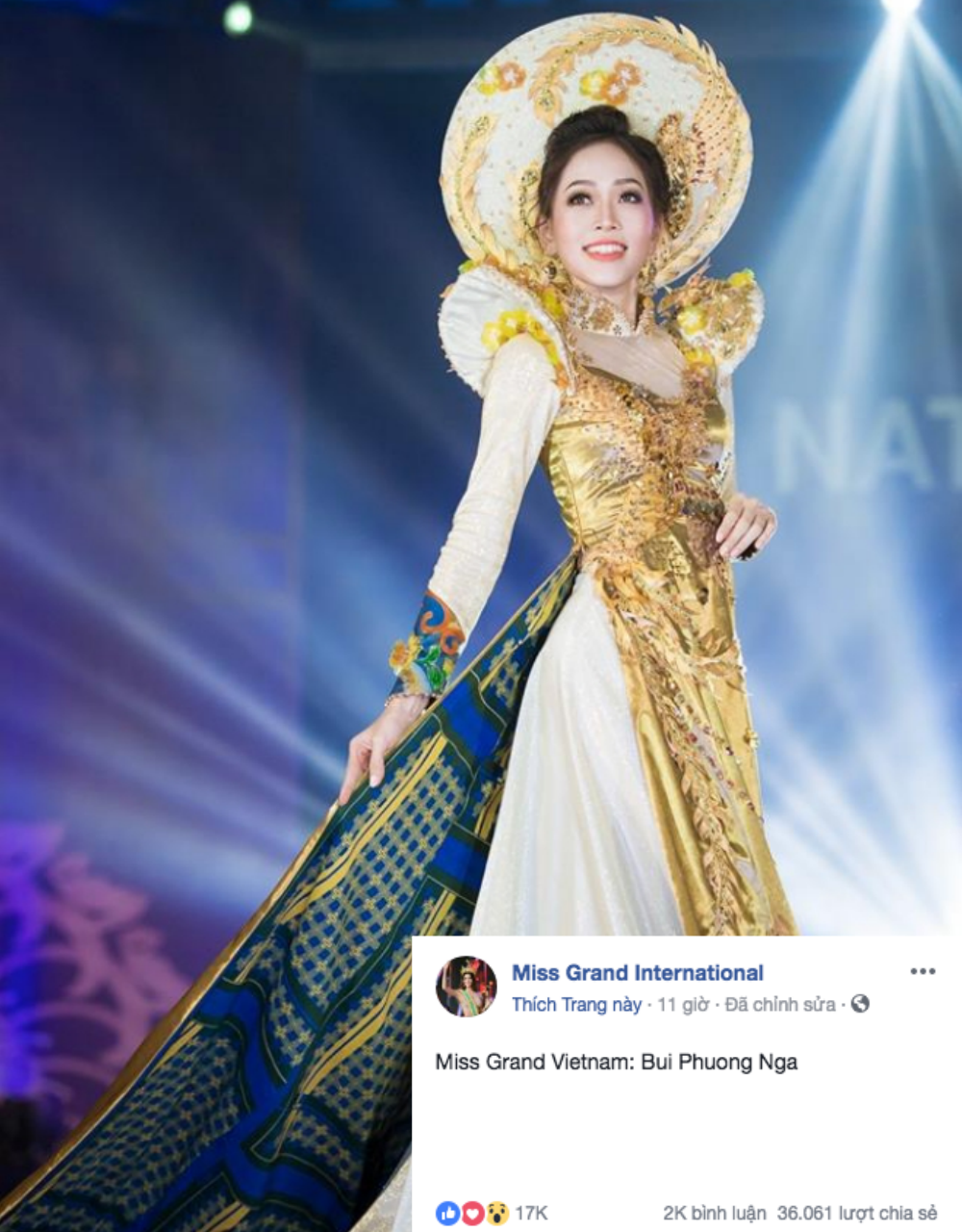Đại diện Việt Nam tại Miss Grand International 2018 - Bùi Phương Nga lựa chọn trang phục áo dài mang tên Ngũ phụng Tề phi với ý nghĩa “Chim Phụng là loài chim tượng trưng cho những người phụ nữ quyền quý ngày xưa với đức hạnh, duyên dáng và thanh nhã. Với hình ảnh 5 con Phụng hay còn gọi là Ngũ Phụng còn mang ý nghĩa về những điều tốt đẹp nhất với sự mạnh mẽ, quyền lực và đầy khí chất trong văn hóa Việt Nam triều Nguyễn” - Nhà thiết kế Khánh Shyna chia sẻ về ý tưởng thiết kế trang phục truyền thống.