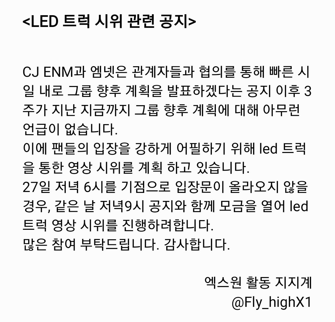 Đã ba tuần kể từ tuyên bố ban đầu, nhưng CJ ENM và Mnet không đưa ra các thông báo cho kế hoạch trong tương lai của nhóm. Người hâm mộ đang lên kế hoạch chạy video bằng xe tải bảng LED để phản đối và yêu cầu CJ ENM phát hành thông báo về nhóm và để bảo vệ các thành viên. Trong trường hợp không có bất cứ tuyên bố nào được đưa ra trước 6h tối (KST) ngày 27/12, chúng tôi sẽ gây quỹ vào lúc 9h tối cùng ngày và tiến hành các cuộc biểu tình xe tải LED. Chúng tôi đánh giá cao về vấn đề này và mong được tiếp tục nhận được sự hỗ trợ và tham gia của các bạn”.